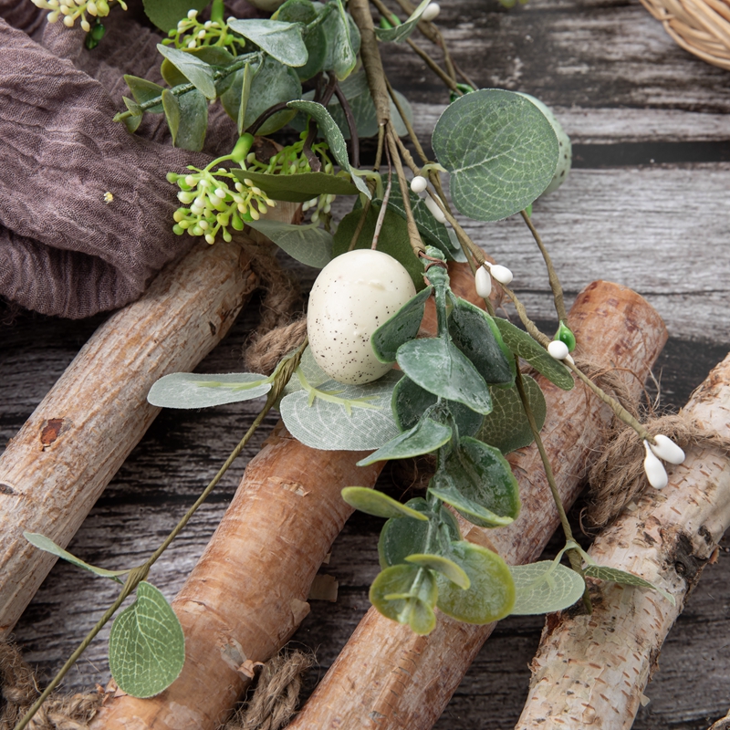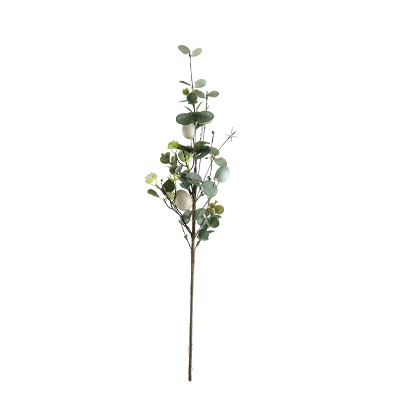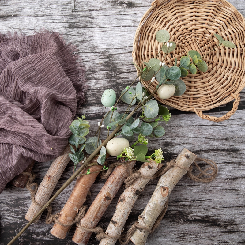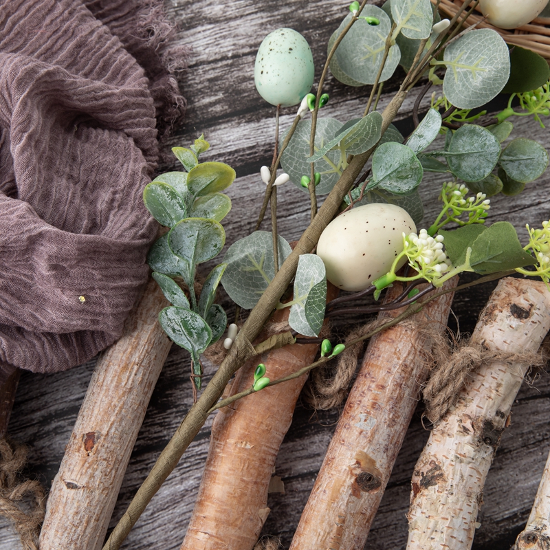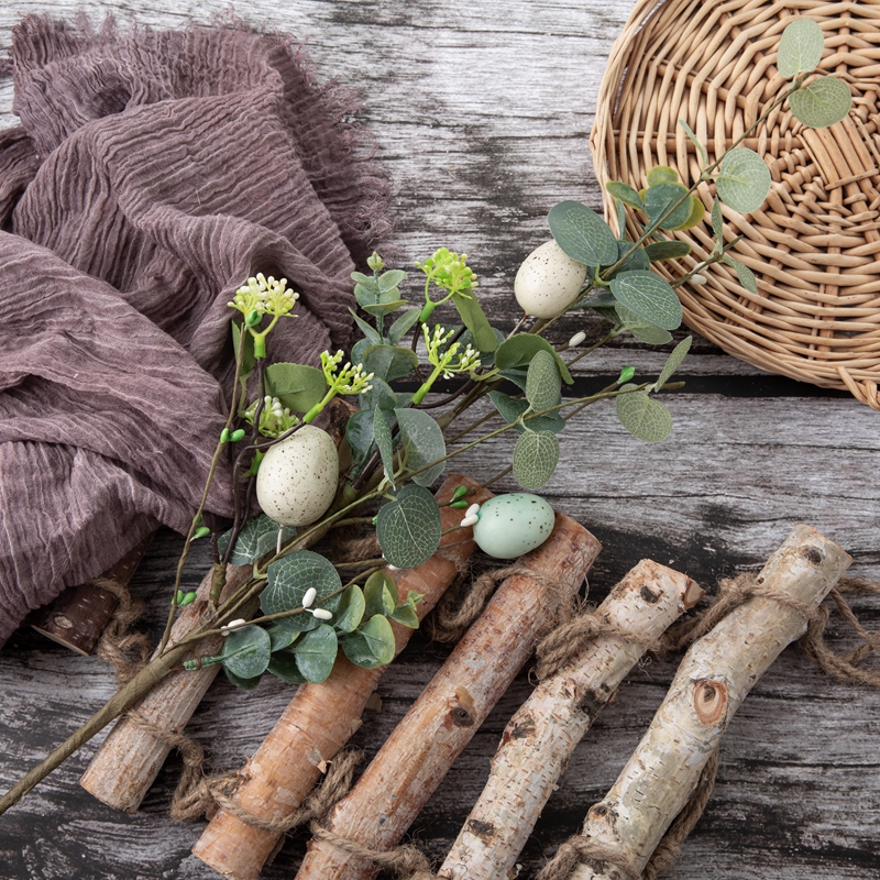 The Yugali Easter Egg Bundle is crafted from high-quality plastic, fabric, Polyron, hand-wrapped paper, and PE plastic. The eggs are made of thick plastic, providing a sturdy structure, while the hand-wrapped paper accents add a delicate touch. The leafy accessories are crafted from Polyron, enhancing their natural appearance.