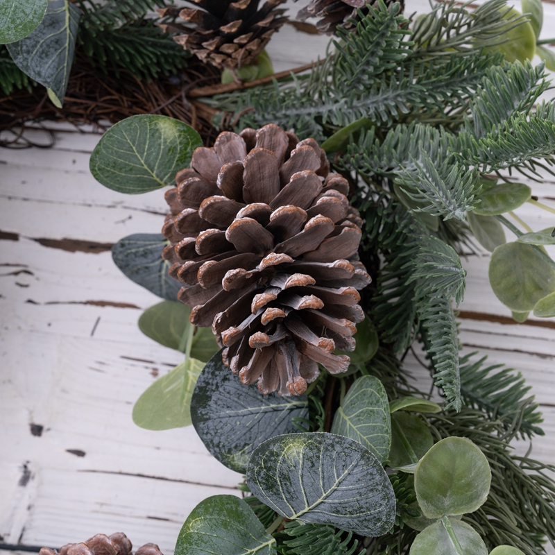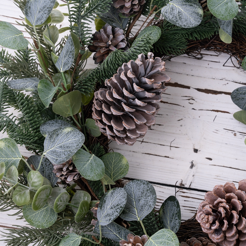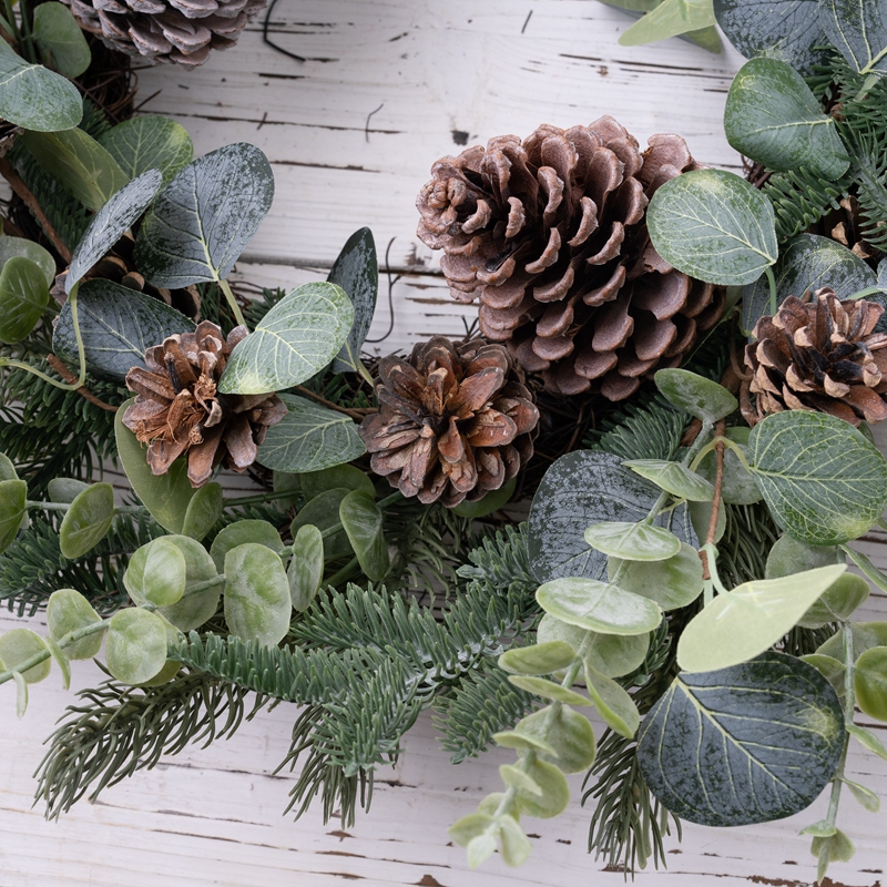 Item No. CL54627, a stunning creation from CALLAFLORAL, combines the essence of nature with a touch of modern design. This Eucalyptus Pine Needle Pine Cone Large Ring is crafted from a delightful blend of plastic, fabric, wood branch, natural pine cone, and wire. The result is a decorative piece that is not only high in quality but also environmentally friendly.
