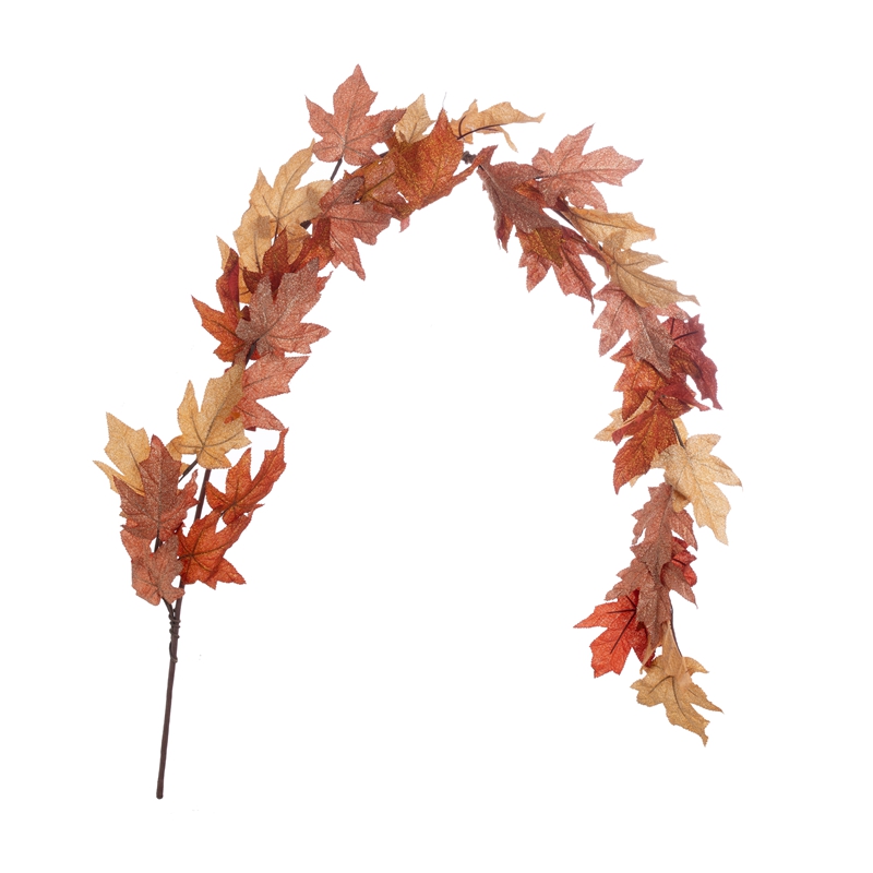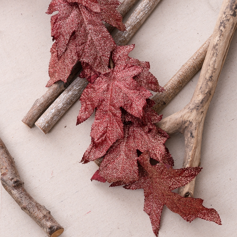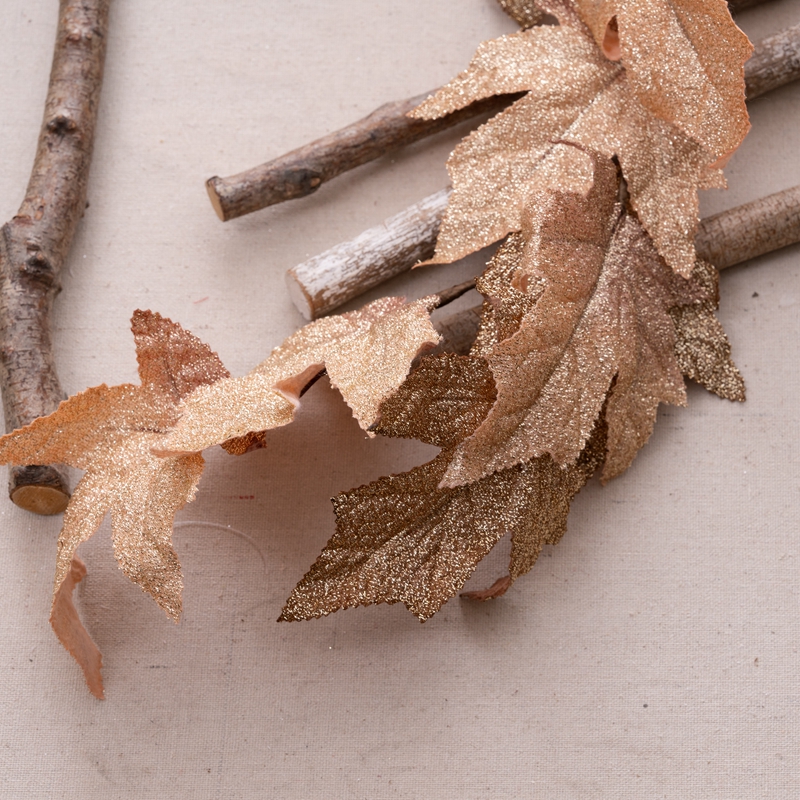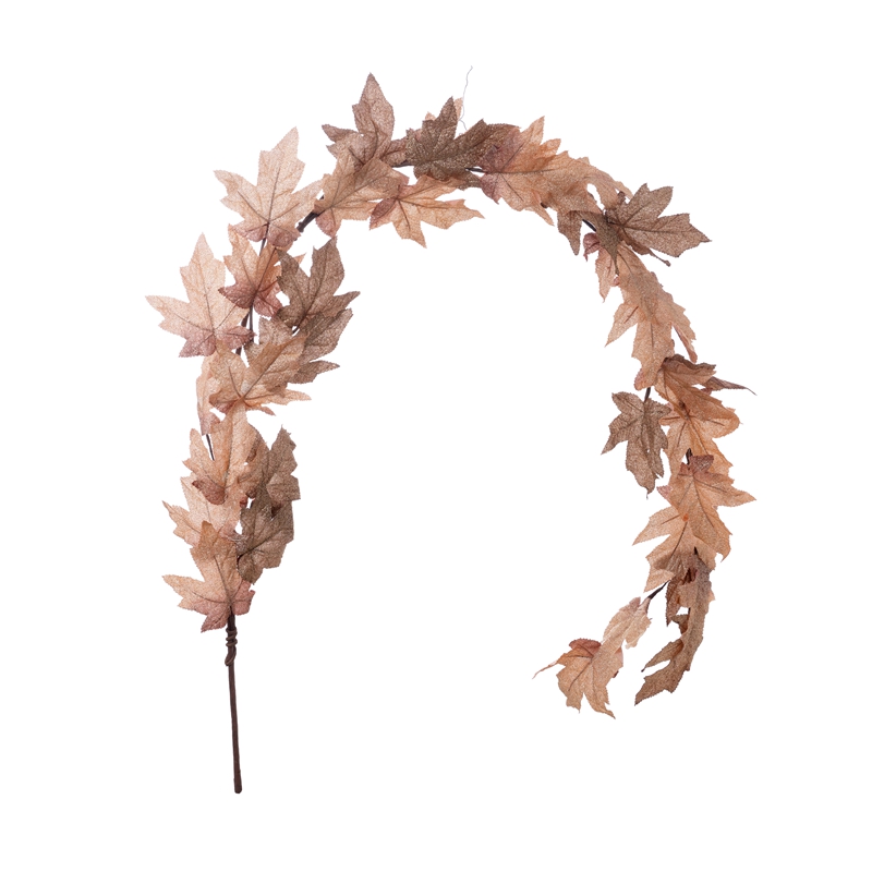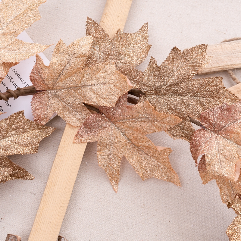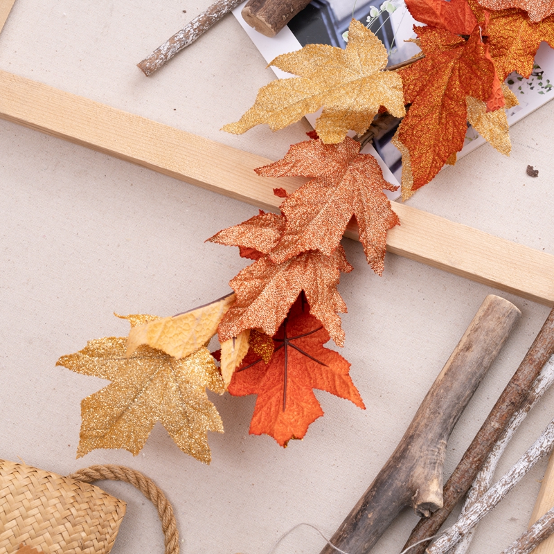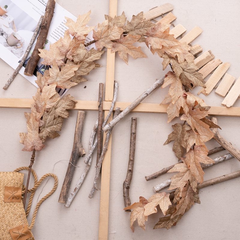 Introducing the Golden Maple Leaf Vines, a stunning and exquisite product that will captivate any audience. This beautiful piece is made from a combination of plastic, fabric, and sprinkling gold, making it a visual treat.