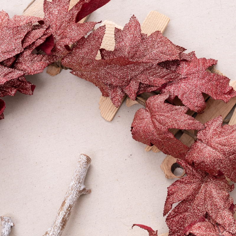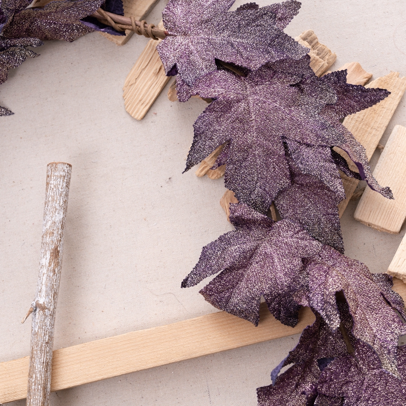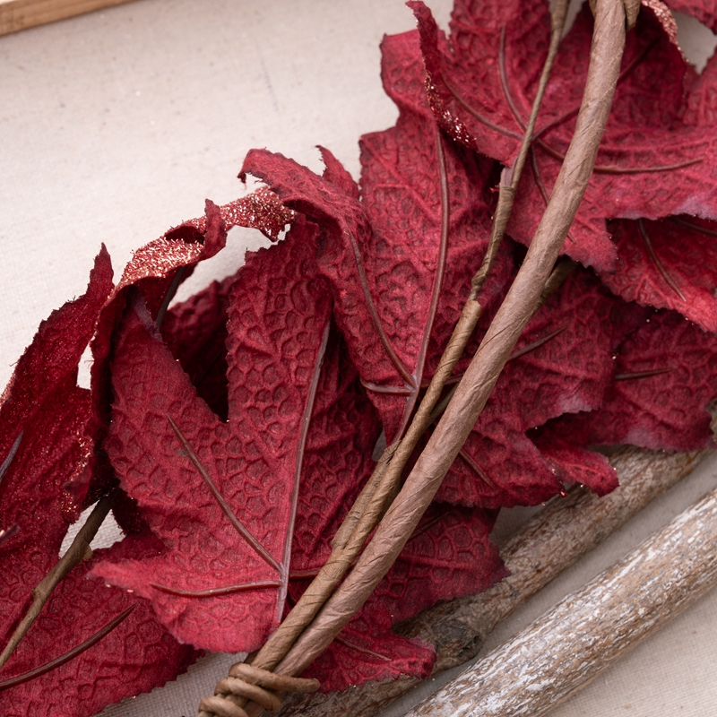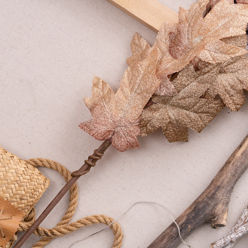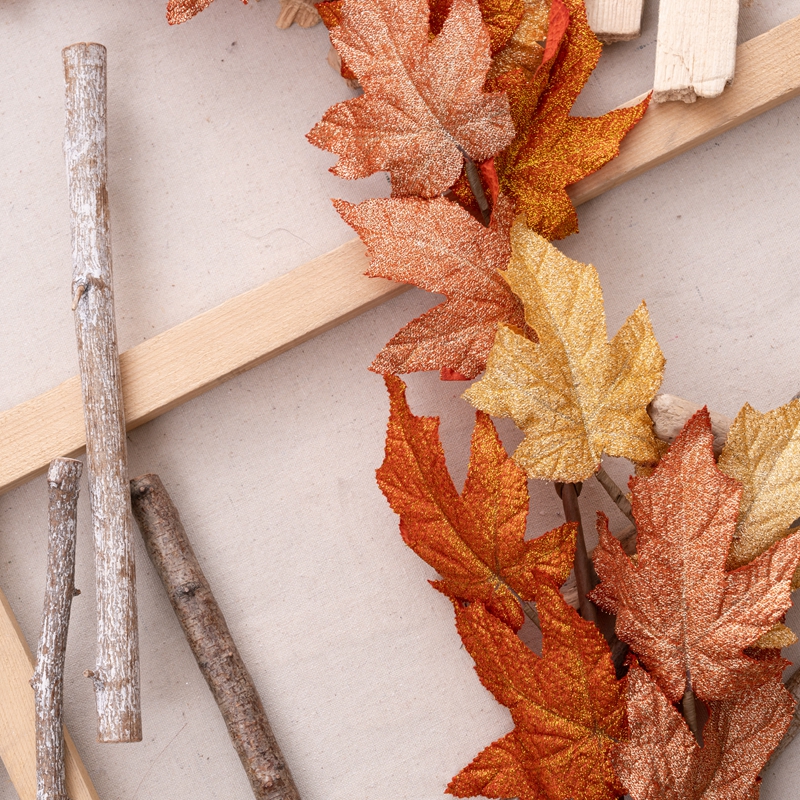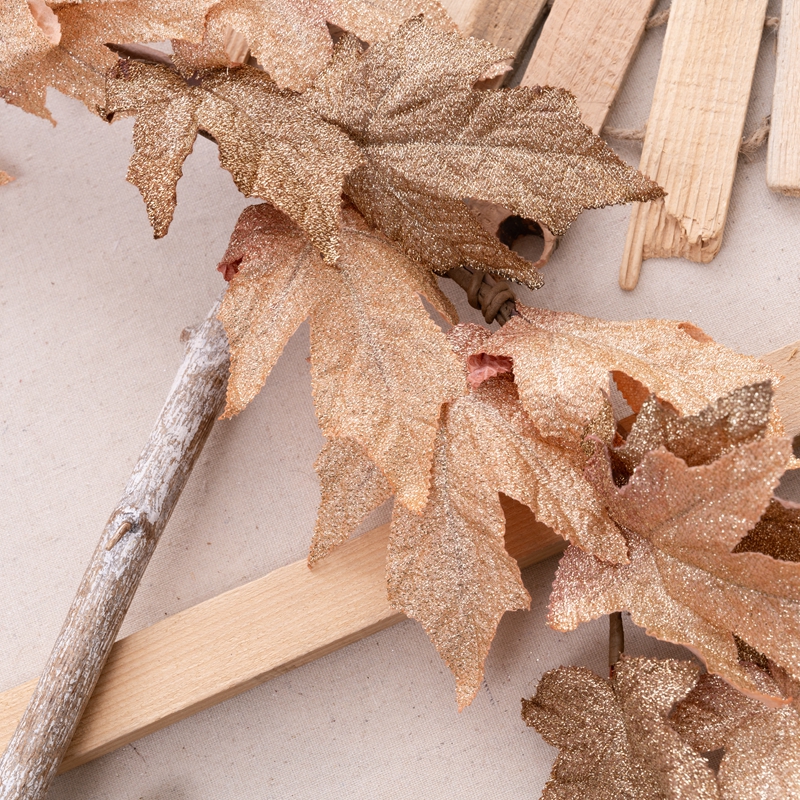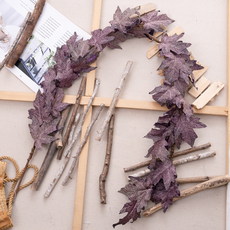 Introducing the Golden Maple Leaf Vines, a stunning and exquisite product that will captivate any audience. This beautiful piece is made from a combination of plastic, fabric, and sprinkling gold, making it a visual treat.