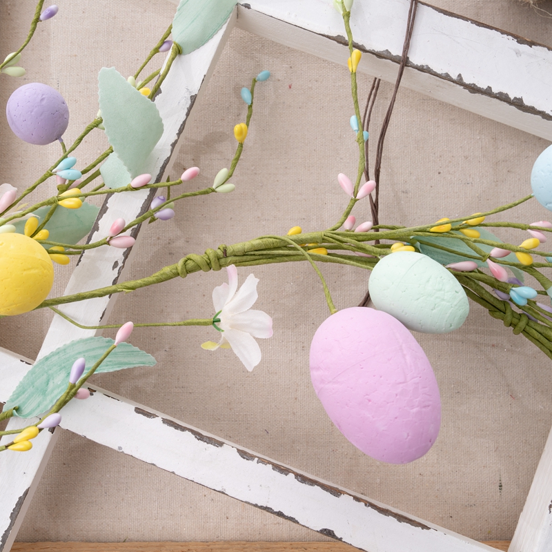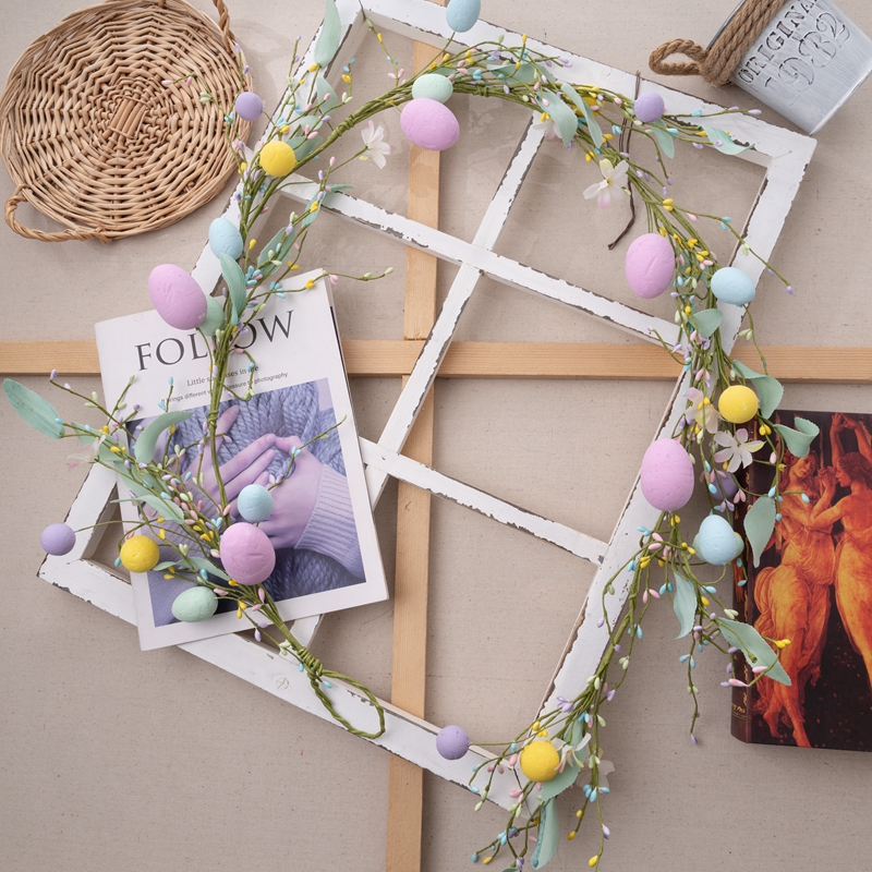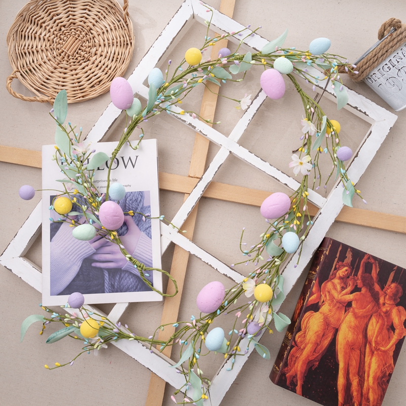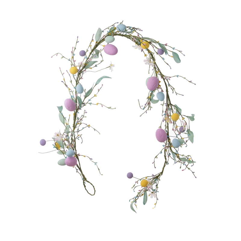 The Easter Egg Garland is a hand-crafted creation, made from a combination of fabric, polyron, and hand-wrapped paper. Each egg is individually designed and crafted, resulting in a realistic and charming look. The garland features a variety of resurrection eggs, small flower heads, face bead branches, and PE leaves, all arranged in a long vine for maximum impact.