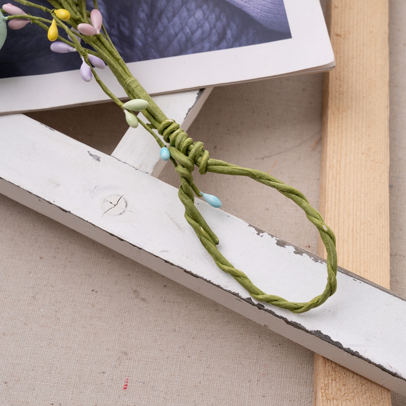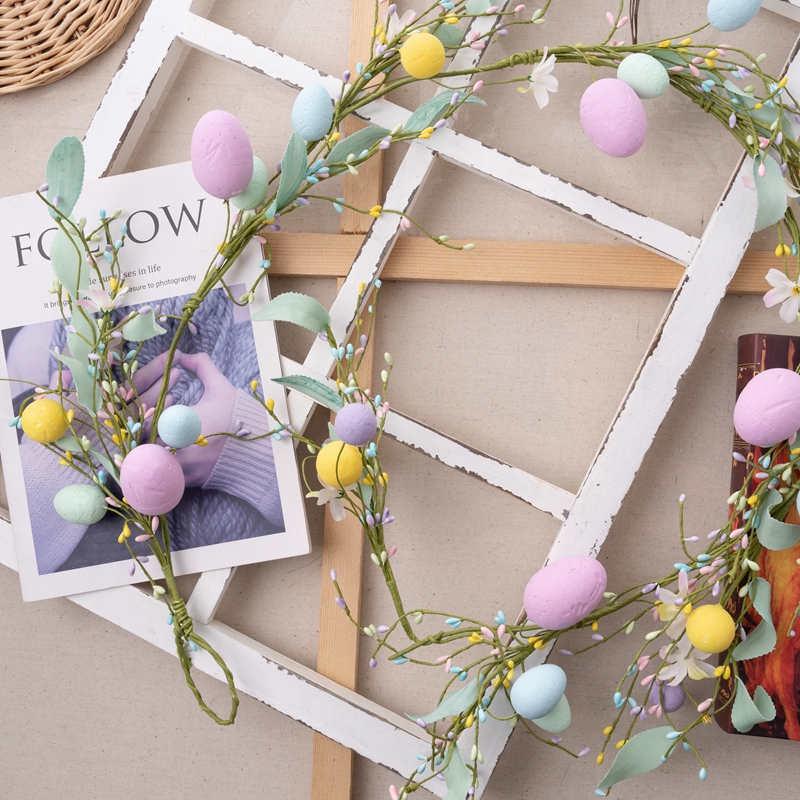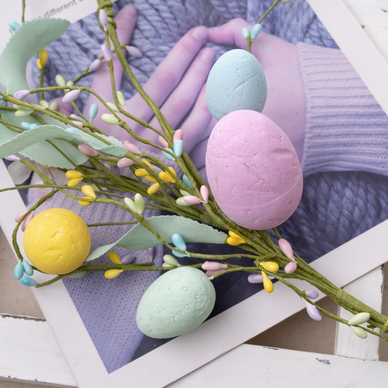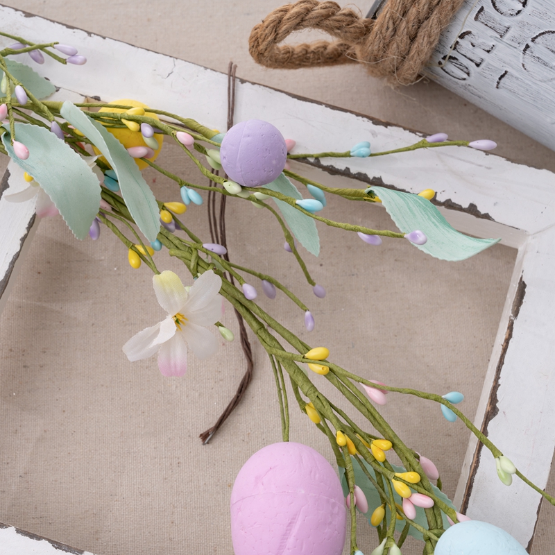 Each Easter Egg Garland is priced as one unit and consists of multiple elements, including resurrection eggs, small flower heads, face bead branches, and PE leaves. The arrangement of these elements creates a festive and eye-catching display that will enhance any celebration or event.