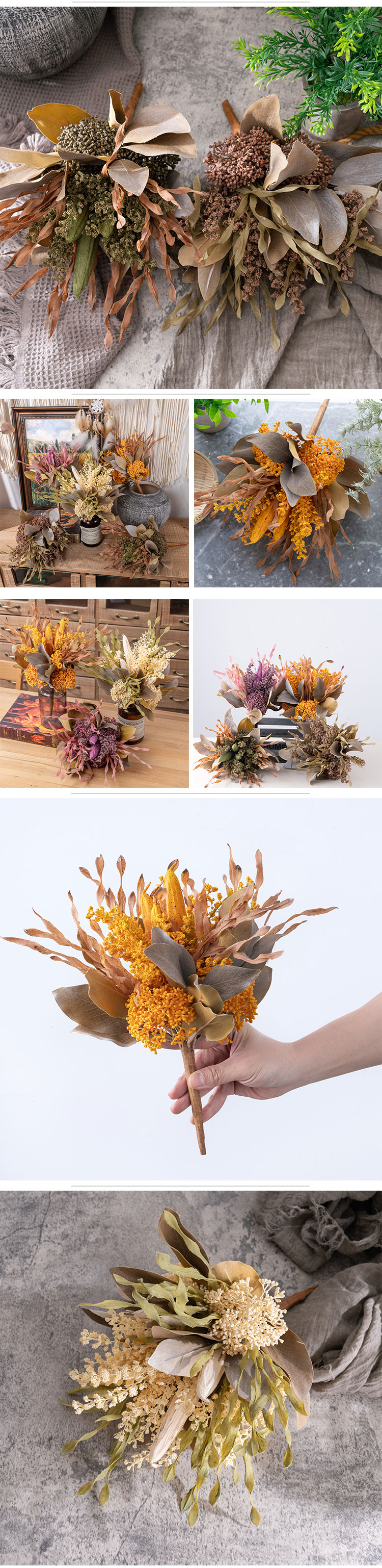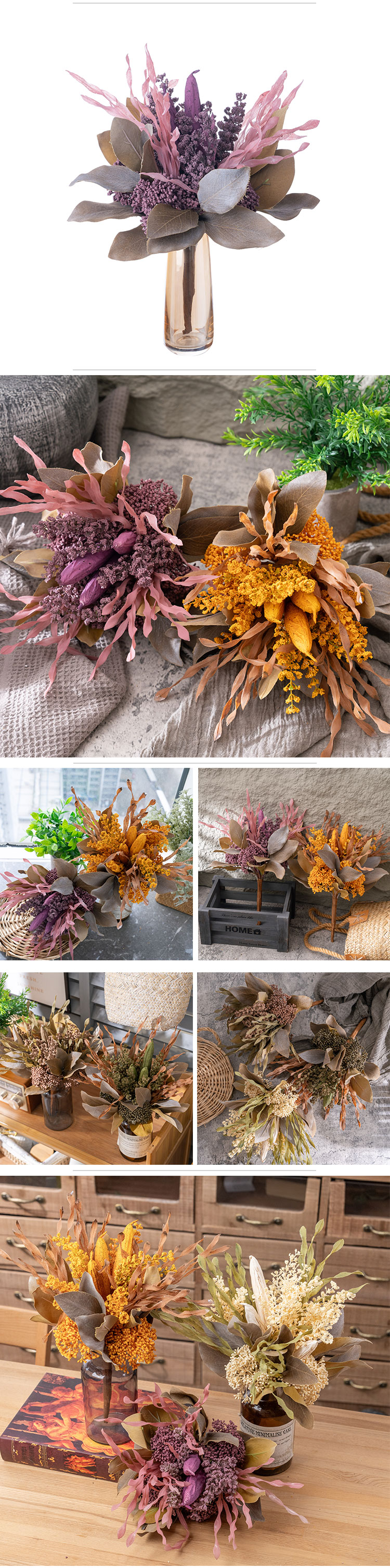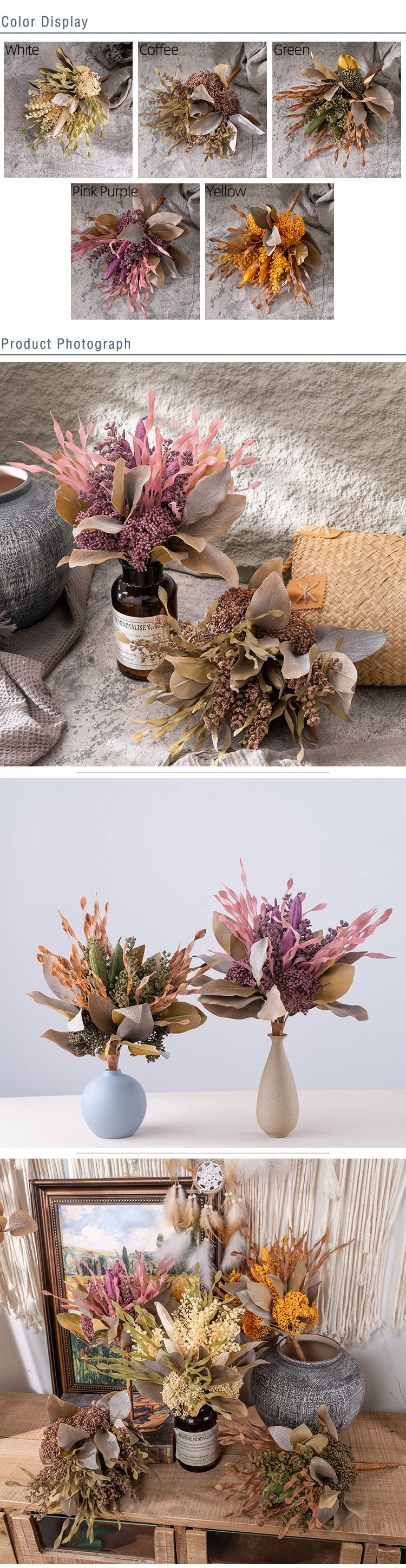 The Seaweed Leaf Bouquet, item number MW62003, is an exquisite combination of beauty and practicality, designed to enhance a variety of environments. Crafted from high-quality materials including fabric, foam, paper, and wire, this bouquet stands out for its elegant appearance and durability. With an overall height ranging from 33.5 cm to 36 cm and a diameter of 22 cm to 23 cm, it serves as an eye-catching centerpiece that can fit seamlessly into any décor scheme. Weighing between 134.1 g and 136.3 g, this bouquet is lightweight yet substantial enough to provide a sense of presence without overwhelming the space it occupies. The carefully arranged composition features three stunning okra pieces alongside a delightful assortment of flowers, grass, and leaves, creating a harmonious blend that captures the essence of nature.The bouquet is offered in a variety of colors including coffee, green, pink purple, white, and yellow, allowing customers to select the perfect hue to match their personal style or event theme. Each bouquet is a thoughtful creation, made using a combination of handmade and machine techniques, ensuring that every detail is meticulously crafted to perfection. Designed with versatility in mind, the Seaweed Leaf Bouquet is suitable for a wide range of occasions. Whether adorning a home, bedroom, or hotel lobby, or serving as a decorative element in hospitals, shopping malls, or exhibition halls, this bouquet fits effortlessly into both formal and casual settings. It also enhances special events such as weddings, Valentine’s Day, Mother’s Day, and Christmas, making it the ideal choice for those looking to celebrate life’s milestones with elegance. When purchasing the Seaweed Leaf Bouquet, customers can rest assured knowing they are investing in a product backed by quality certifications such as ISO9001 and BSCI. The bouquets are packaged securely in inner boxes measuring 80*30*15 cm, with each box containing ten pieces, making them convenient for bulk purchases and easy to transport.Payment options are flexible, accommodating various preferences including L/C, T/T, Western Union, Money Gram, and Paypal, ensuring a smooth transaction process for all buyers. In conclusion, the Seaweed Leaf Bouquet is more than just a decorative item; it is a versatile solution for enhancing the ambiance of any space while celebrating all of life's special moments. With its thoughtful design, quality craftsmanship, and wide range of applications, it's an excellent addition to any collection or an ideal gift for loved ones. Choose the Okra Seaweed Leaf Bouquet to bring a touch of natural beauty into your life!