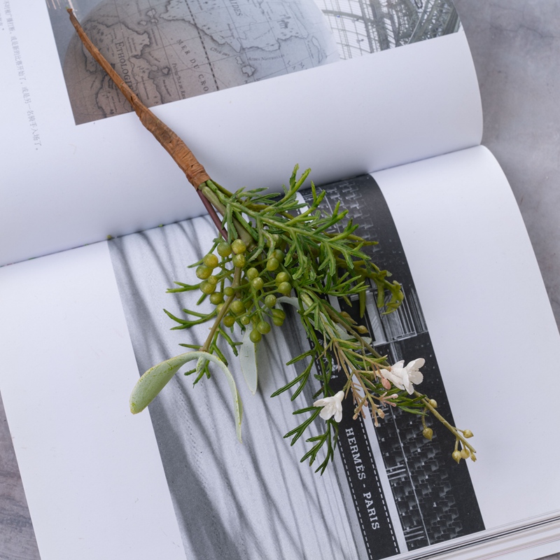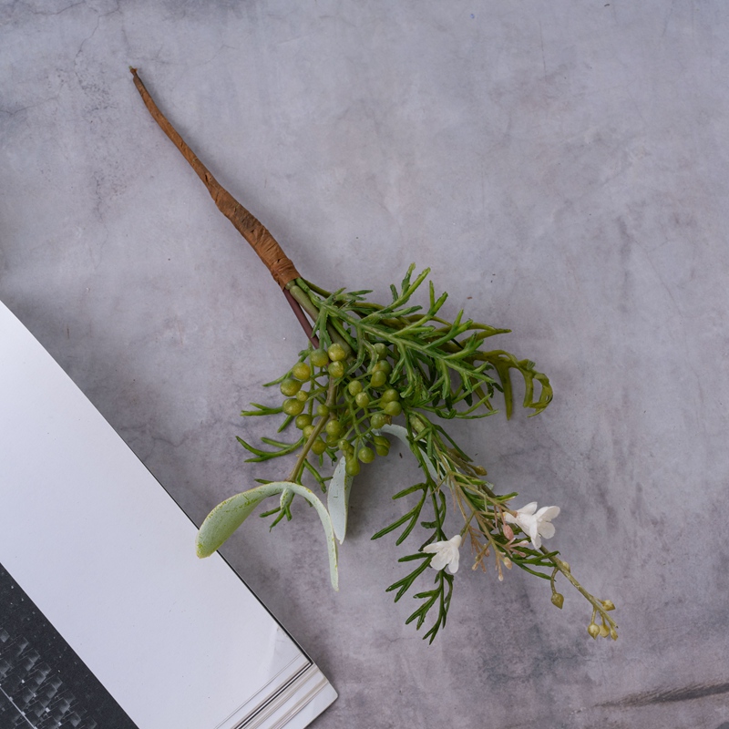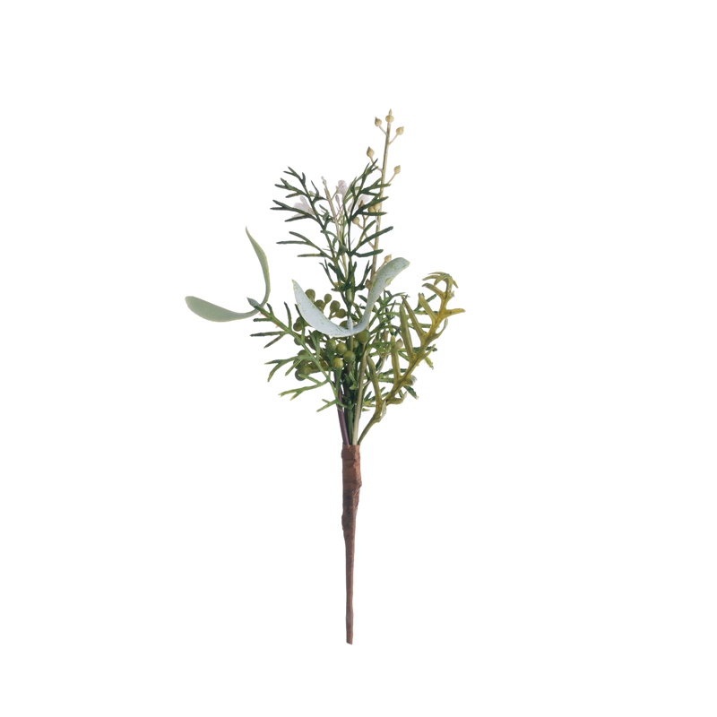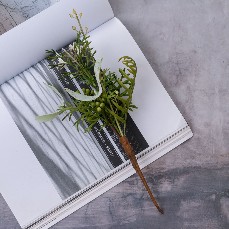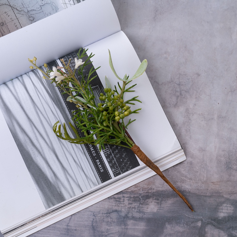 Each bunch is a meticulous composition, featuring water fern leaves that undulate gracefully, mimicking the gentle sway of nature's own greens. Intertwined amidst these verdant hues are the shimmering cubeba fruits, their rich tones inviting a closer inspection, revealing nature's intricate details. To complete this captivating scene, mini wintersweet blossoms add a delicate touch of winter magic, painting a picture of serenity and tranquility.