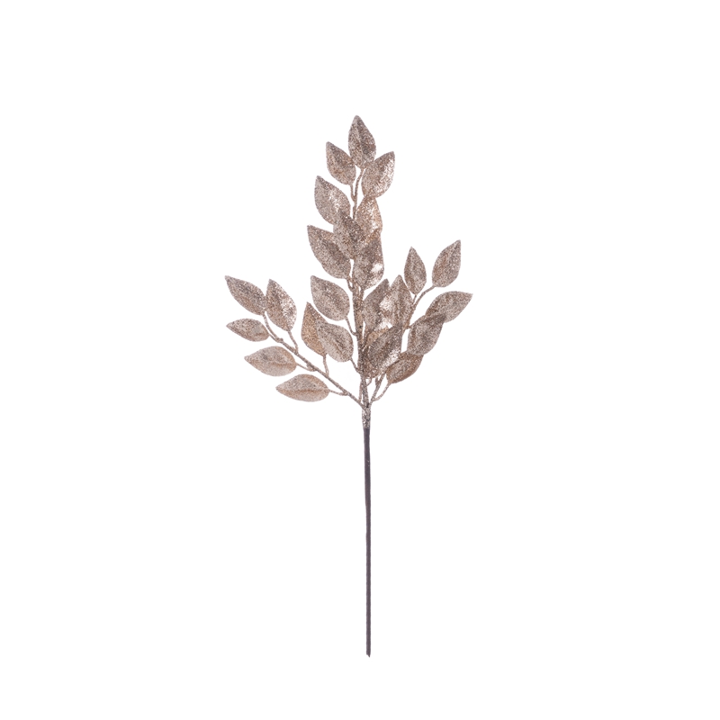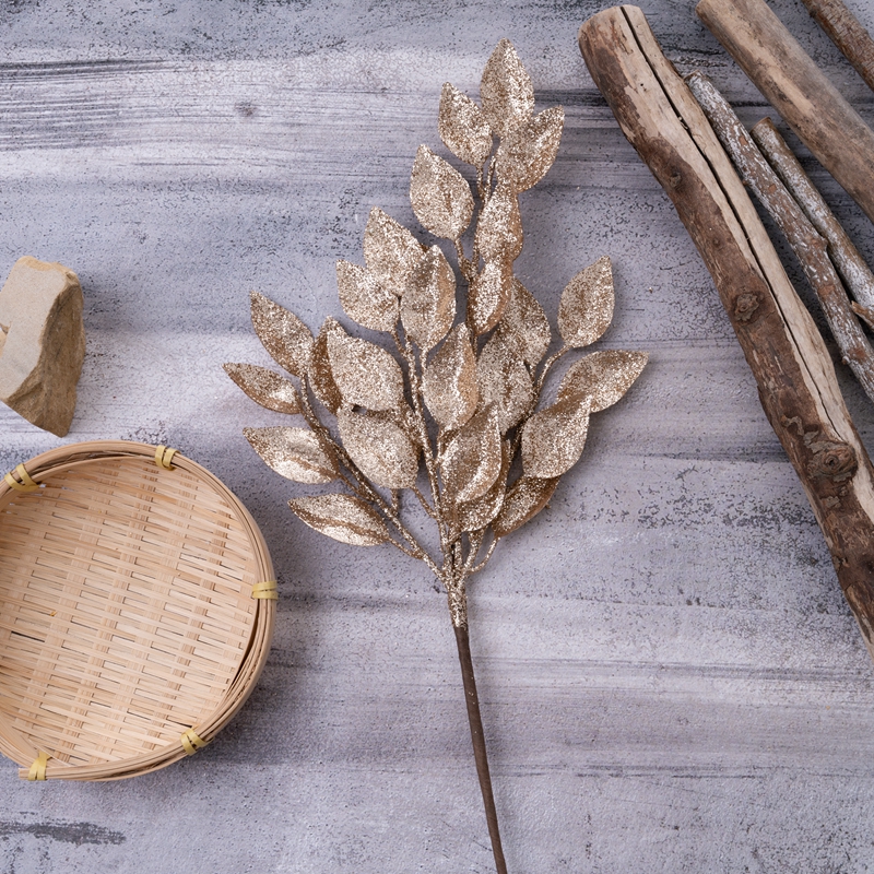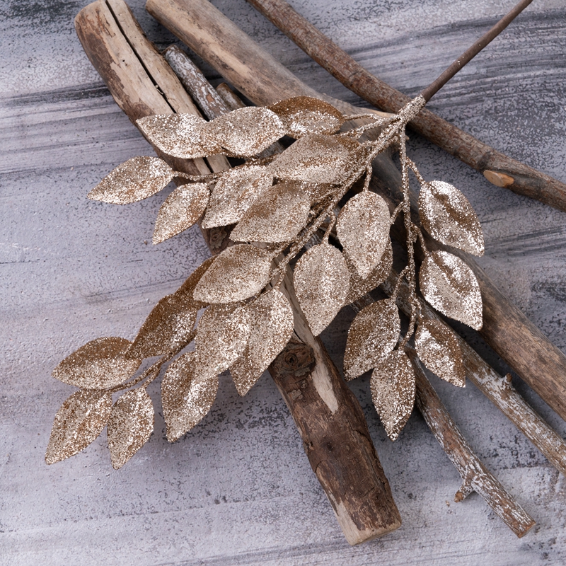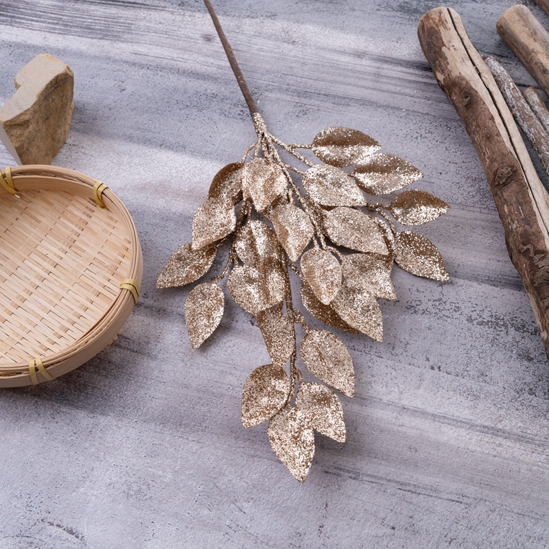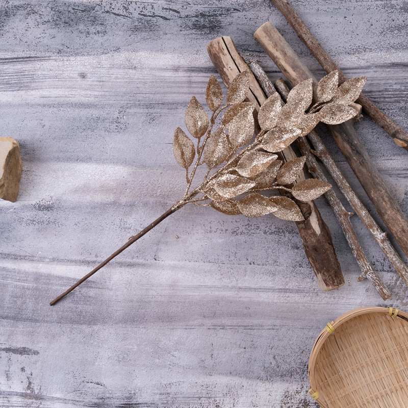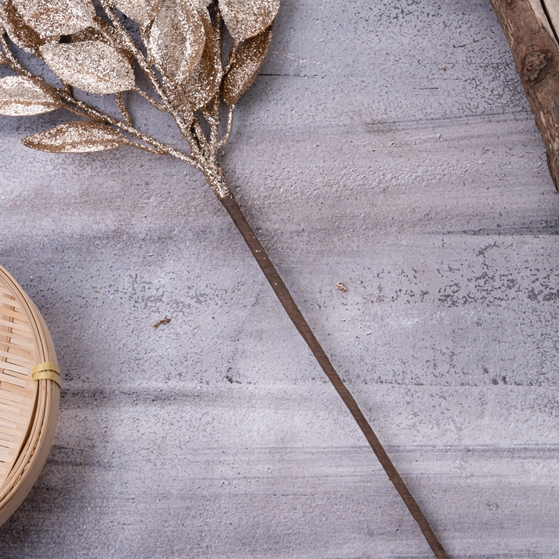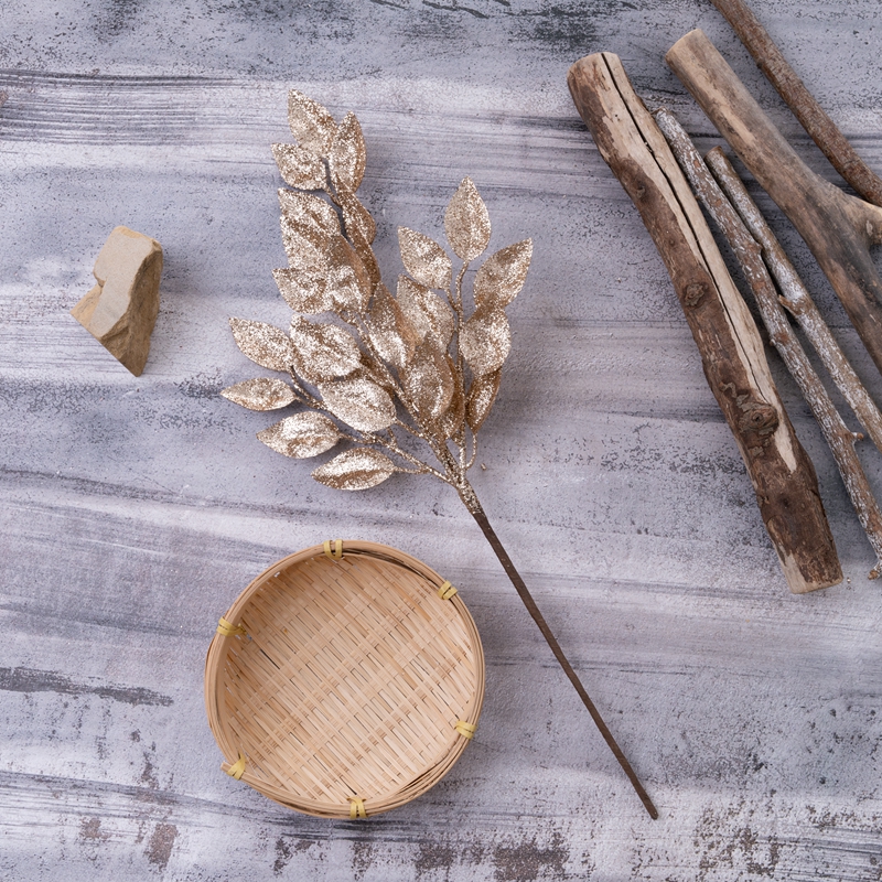 The Golden Leaves Single Spray is crafted from high-quality plastic, glitter, and hand-wrapped paper. The plastic provides a sturdy base, while the glitter adds a touch of sparkle and shine. The hand-wrapped paper creates a luxurious and elegant finish.