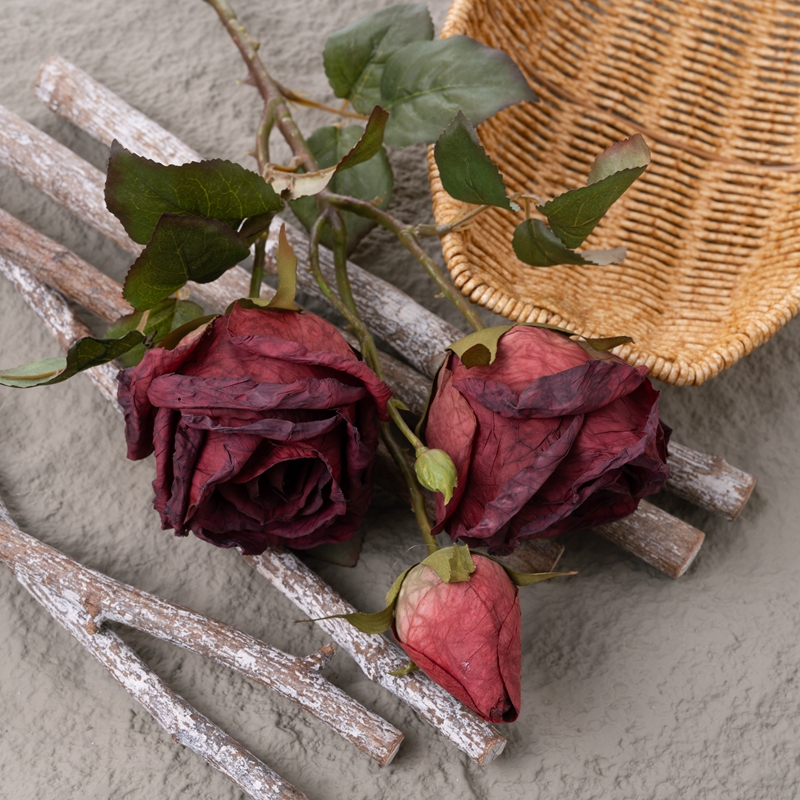At the heart of this centerpiece are three regal rose heads, each meticulously crafted to embody the grace and dignity of the real thing. The petals, crafted from a combination of plastic and fabric, exude a vibrant beauty that draws the eye and captivates the observer.