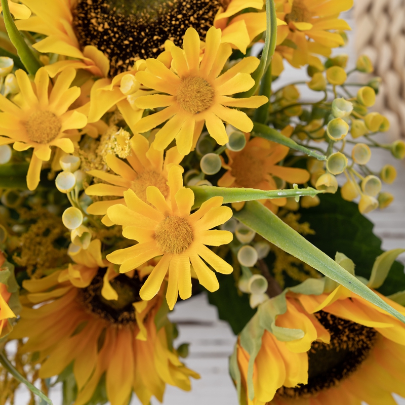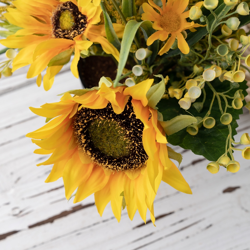 Each pot contains one sunflower large flower head, two sunflower middle flower heads, two sunflower small heads, along with matching flowers, accessories, and leaves. The lifelike appearance and rich yellow colour of the sunflowers add a vibrant and cheerful ambiance to any space.