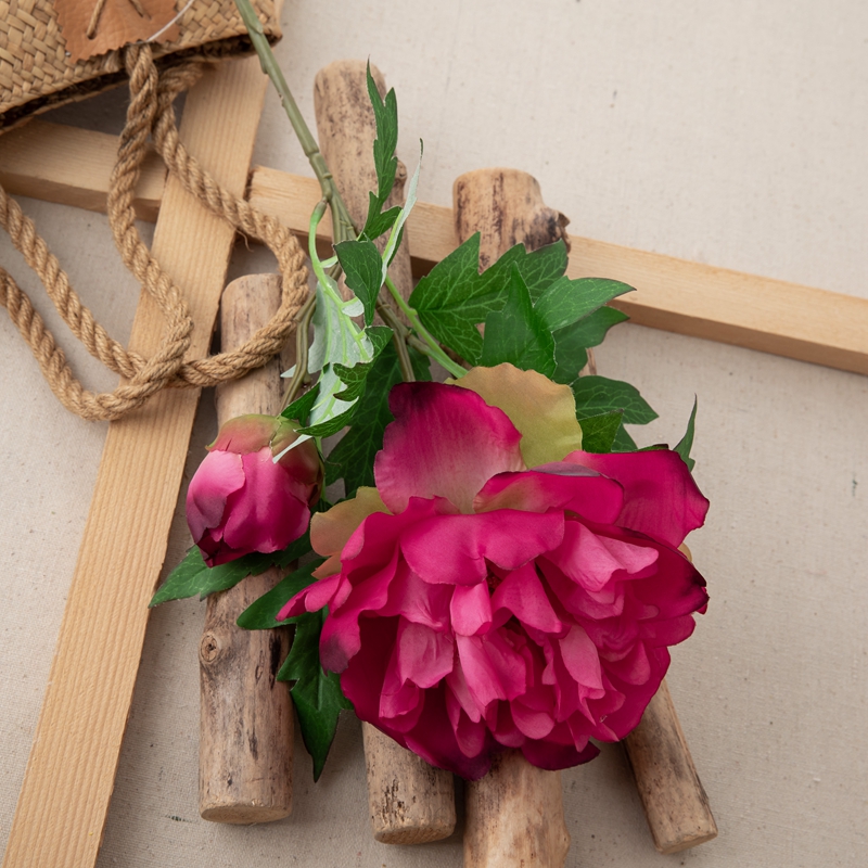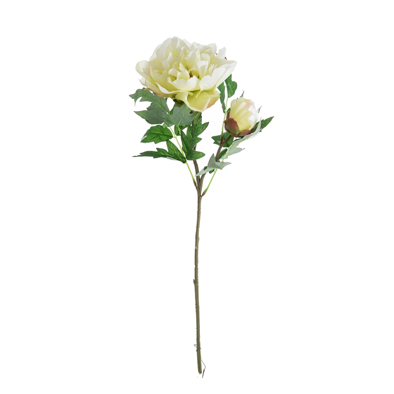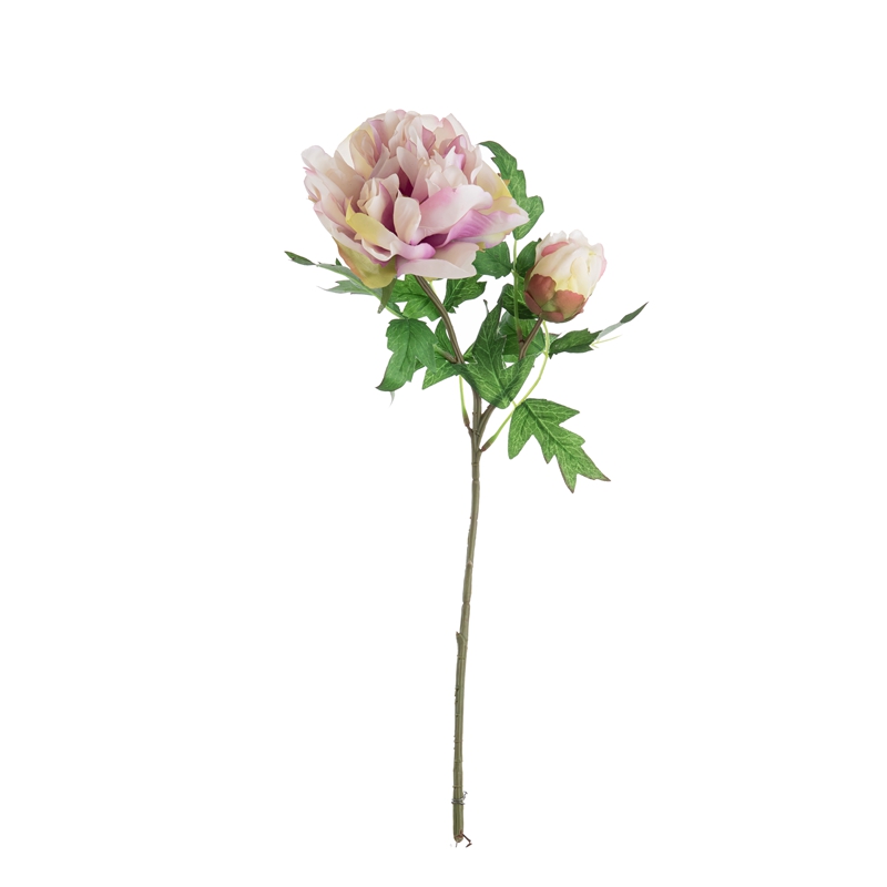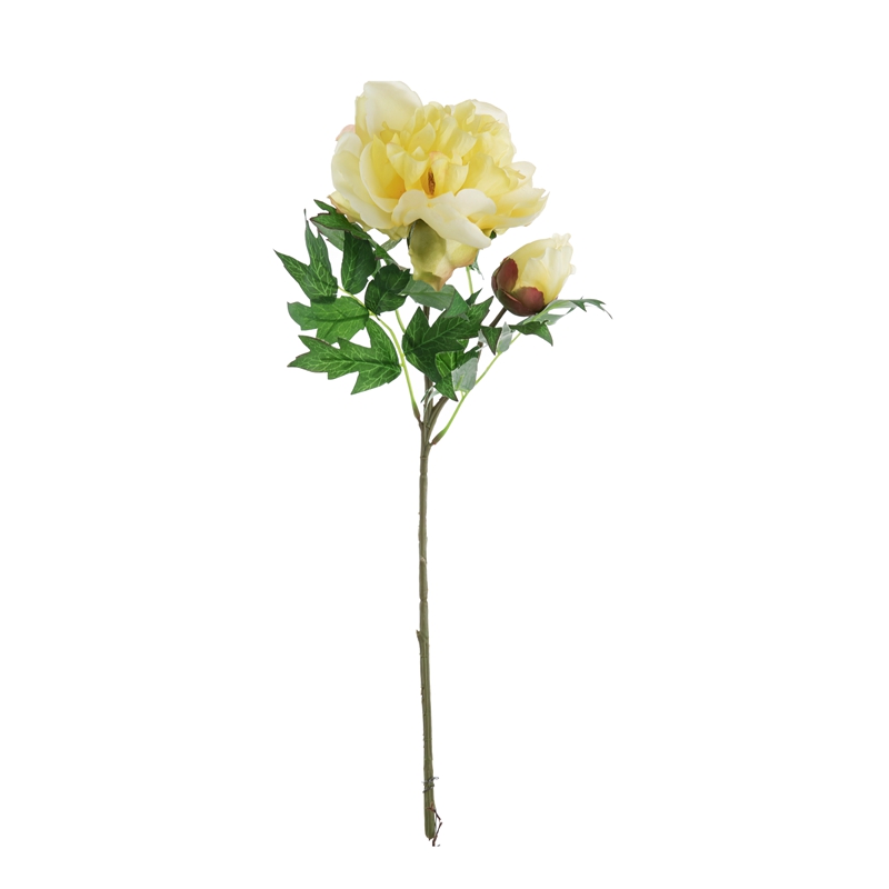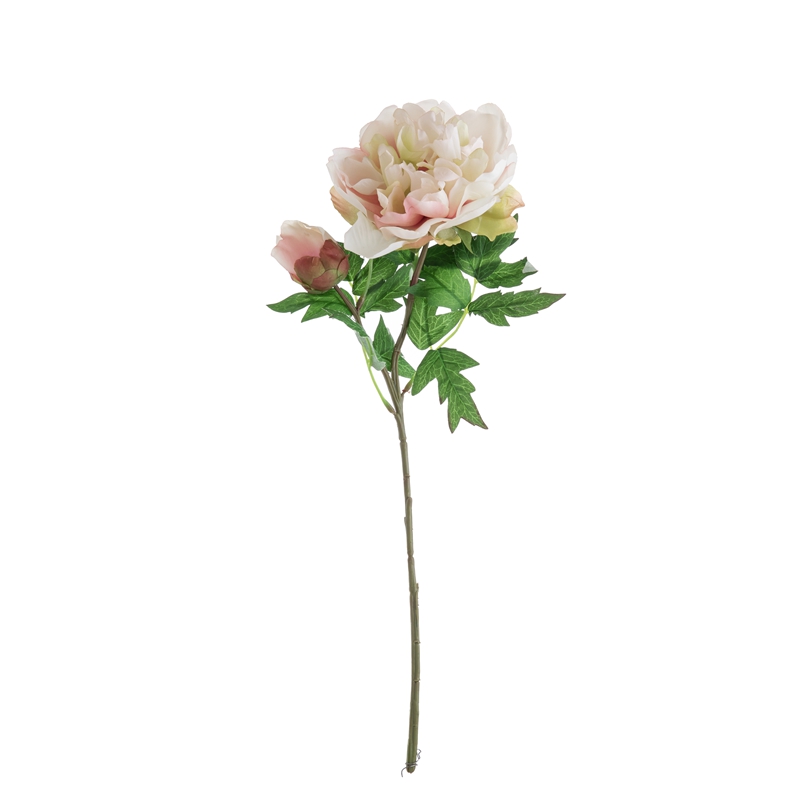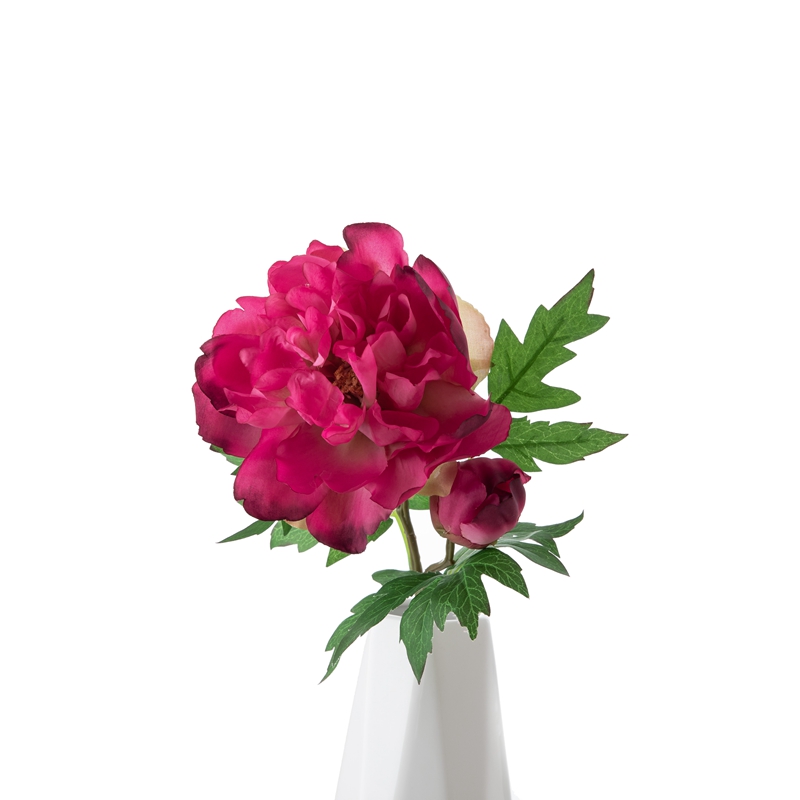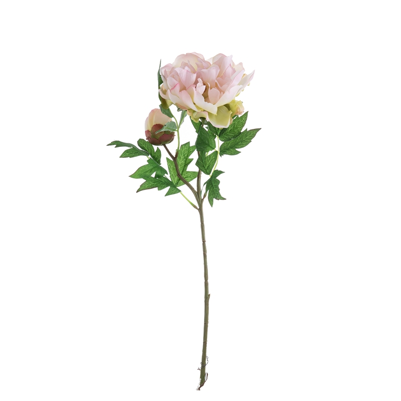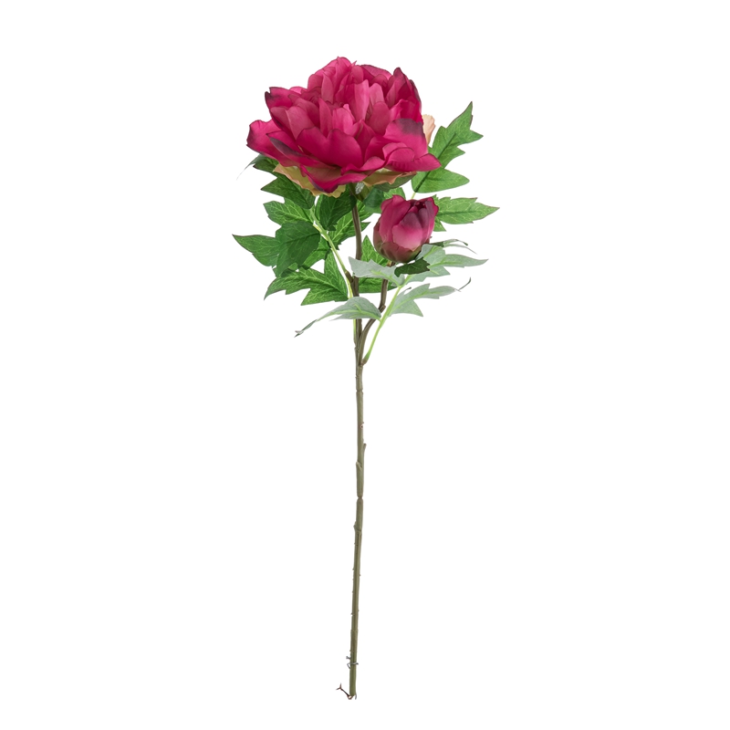 Our popular DY1-3096 single branch flower features a stunning peony flower head standing 5.5cm tall with a diameter of 13.5cm, complemented by a single peony flower bud with a diameter of 5.2cm, and several matching leaves. The overall height of the flower is 46cm, and it weighs only 22g.All of our products are certified by ISO9001 and BSCI for their quality and production standards.