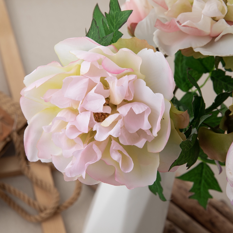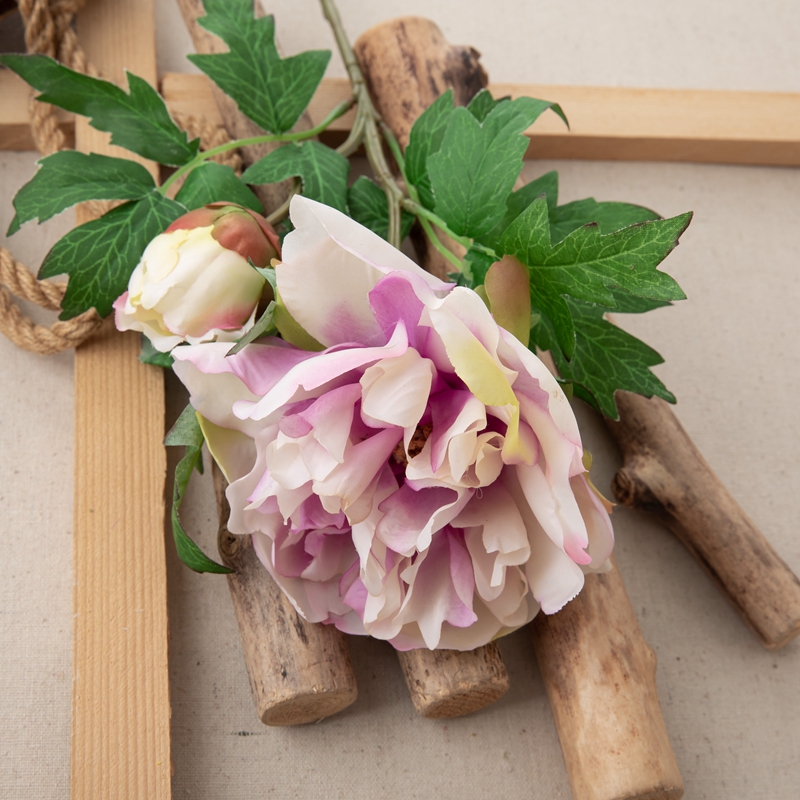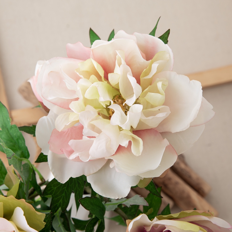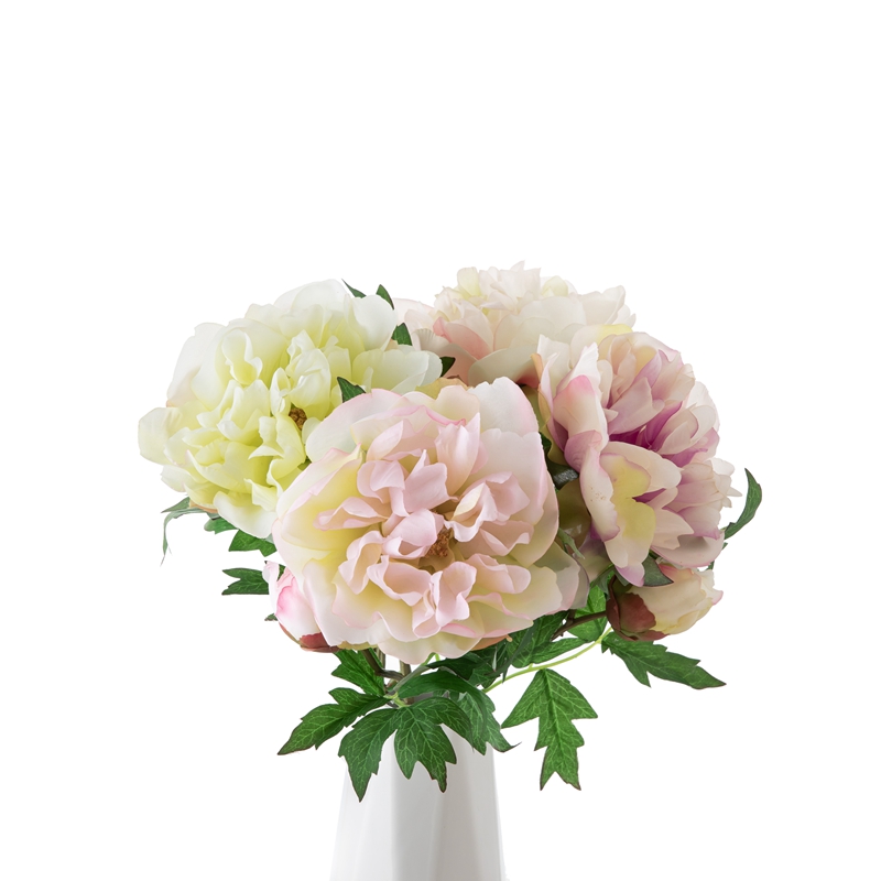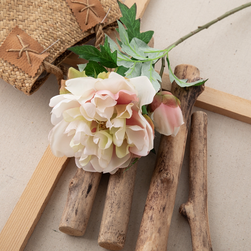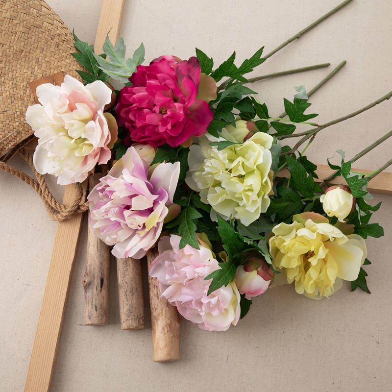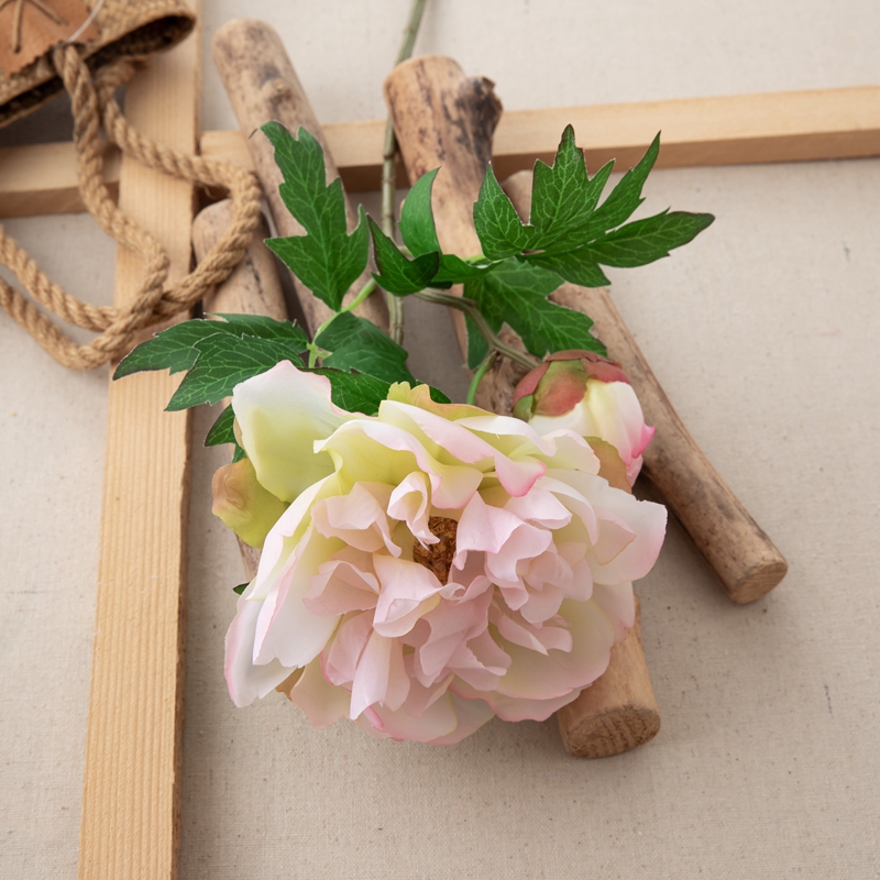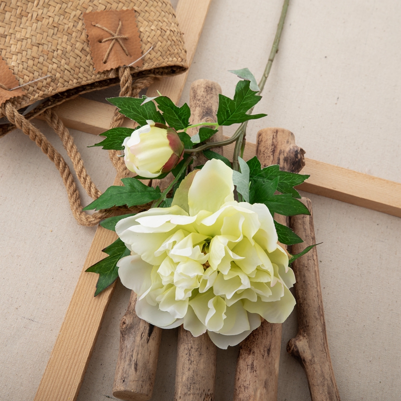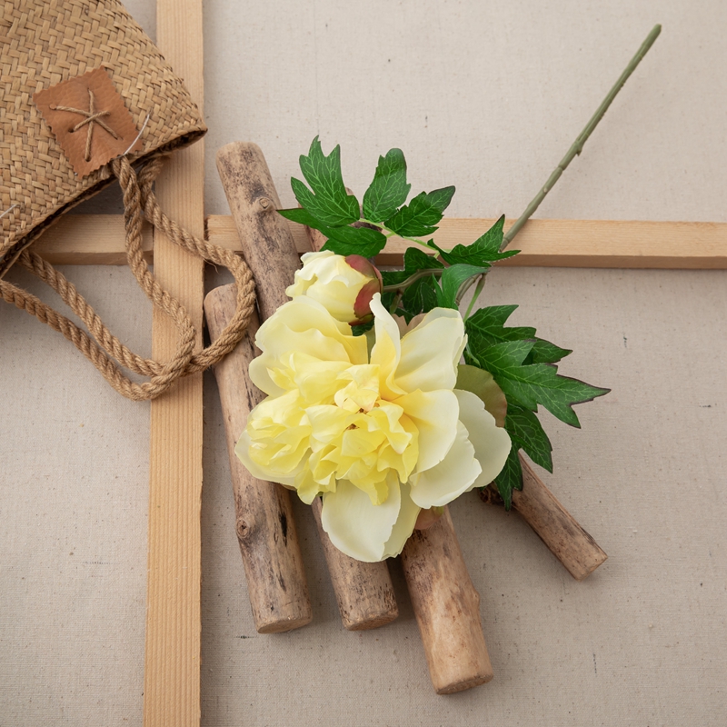 Our popular DY1-3096 single branch flower features a stunning peony flower head standing 5.5cm tall with a diameter of 13.5cm, complemented by a single peony flower bud with a diameter of 5.2cm, and several matching leaves. The overall height of the flower is 46cm, and it weighs only 22g.All of our products are certified by ISO9001 and BSCI for their quality and production standards.