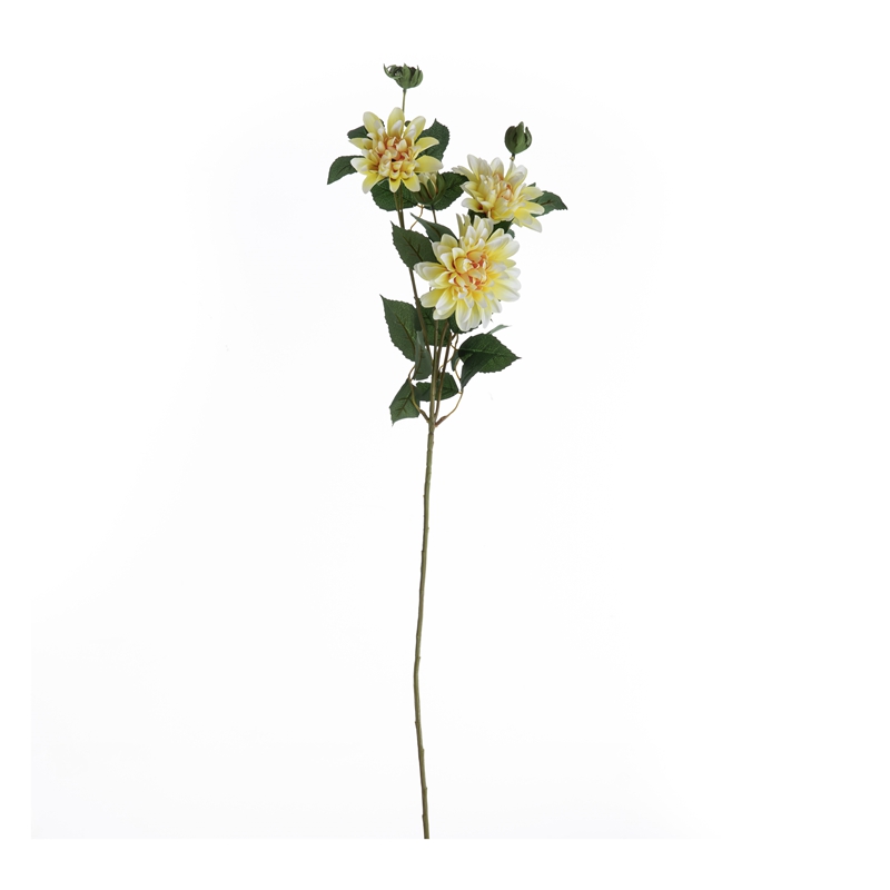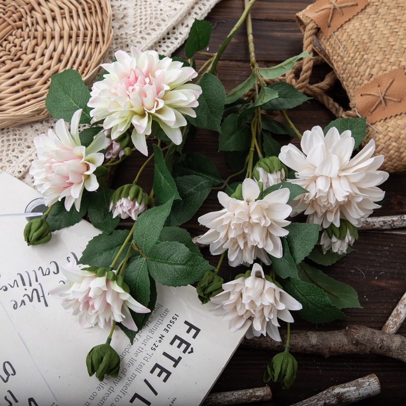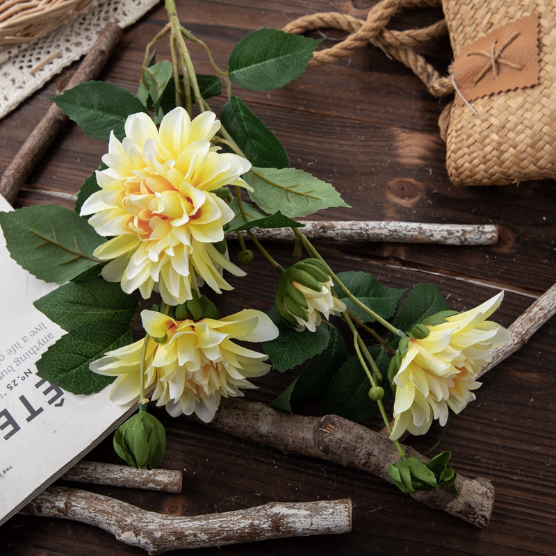 Introducing the DY1-3210A, a magnificent three-flowered and four-bracted Dahlia single branch that embodies elegance and grace. Crafted with a combination of fabric, plastic, and wire, this exquisite creation showcases a harmonious blend of materials for a lifelike appearance.