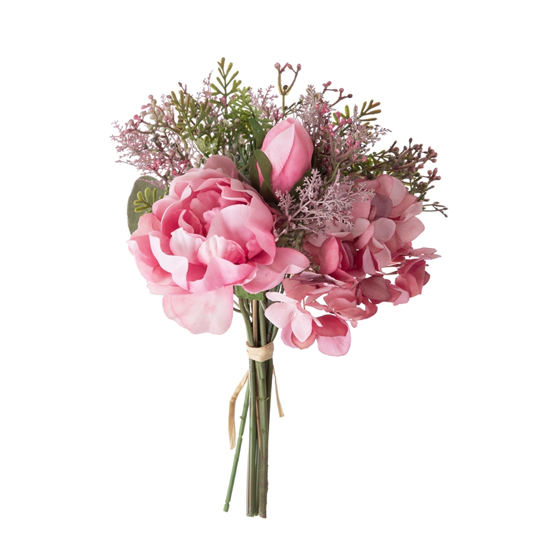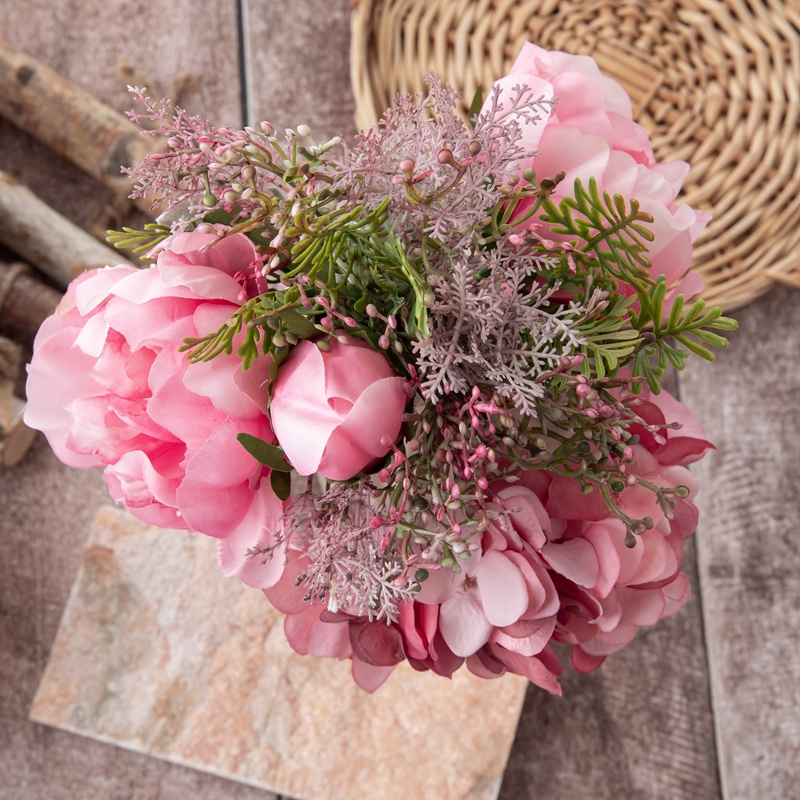 Each bundle includes 1 large peony flower head, 1 small peony head, 1 peony pod, 1 hydrangea head, along with several accessories and leaves. The combination of these elements creates a harmonious and visually captivating arrangement that will be the focal point of any room.