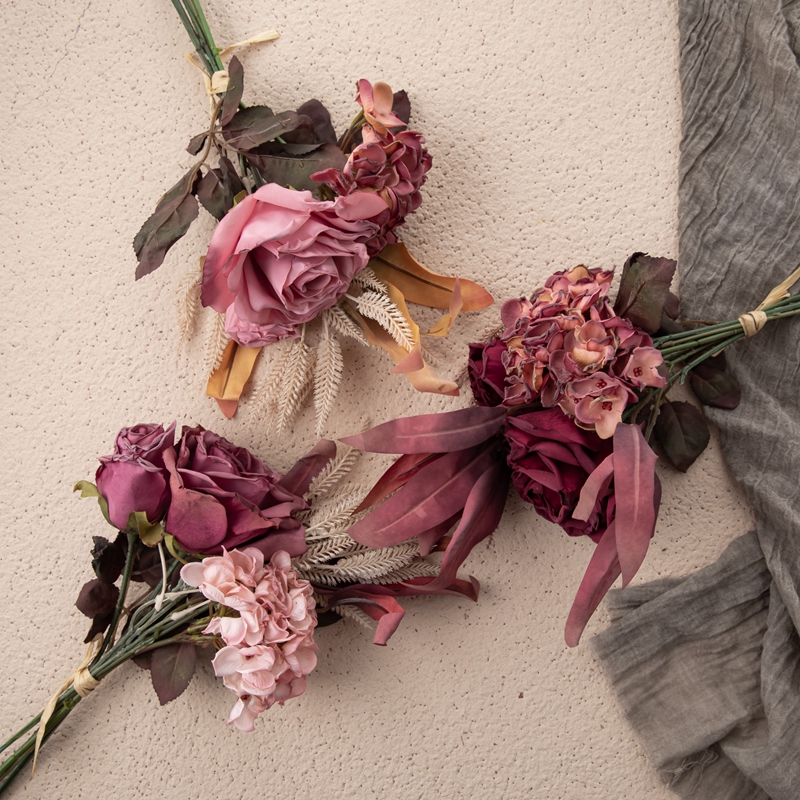Each bunch includes one exquisite rose head, one delicate rose bud, and one captivating hydrangea head, accompanied by matching accessories and leaves. The DY1-4371 Blossom and Bud Rose Hydrangea Bundle is available in a range of timeless colors, including Ivory, Deep and Light Pink, Rose Pink, White Purple, Dark Pink, and Champagne. This variety allows for personalized choices to suit any decor or event theme.