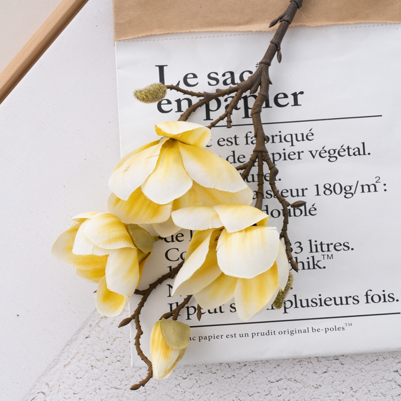 At an elegant overall length of 51cm, the DY1-4666 captivates from the moment you lay eyes on it. The flower head section, spanning 23cm in length, proudly displays its centerpiece: two large magnolia flower heads, each standing tall at 7cm and boasting a diameter of 8cm. Their petals, exquisitely crafted to replicate the smooth texture and lustrous sheen of real magnolias, emanate a sense of grandeur and timelessness.
