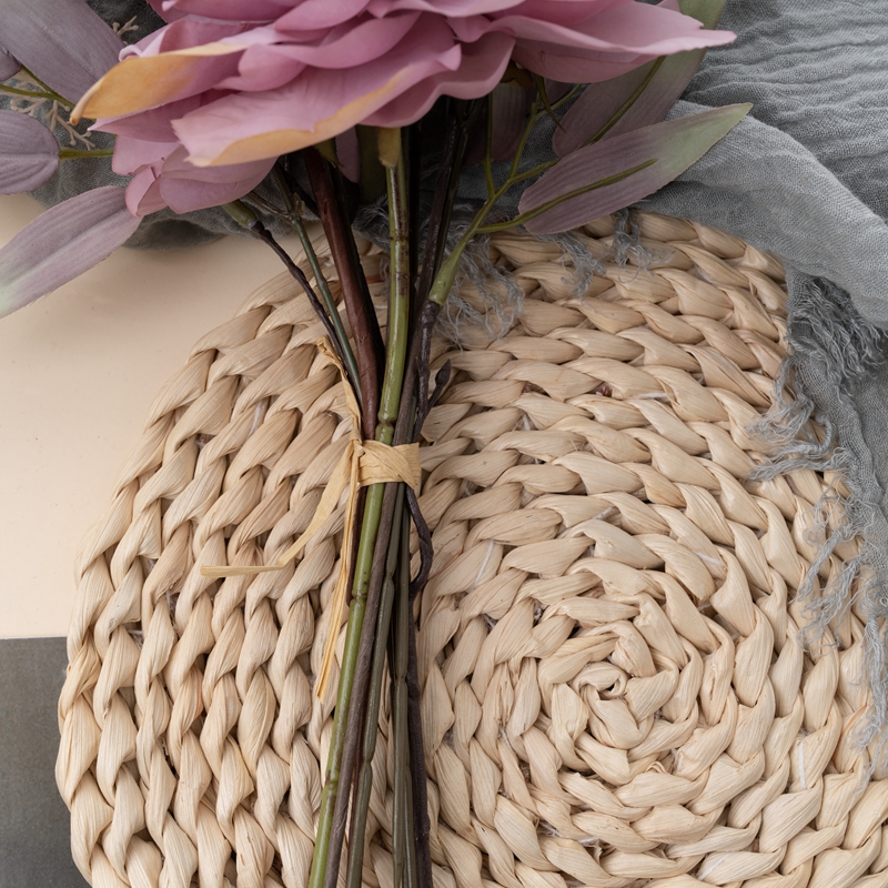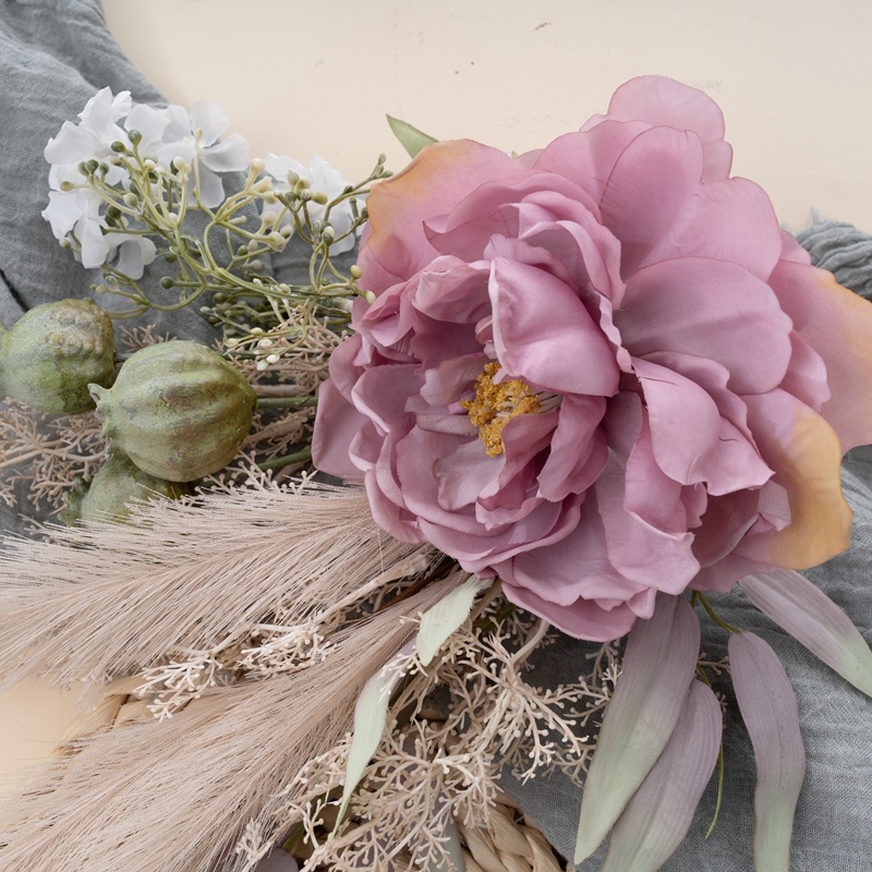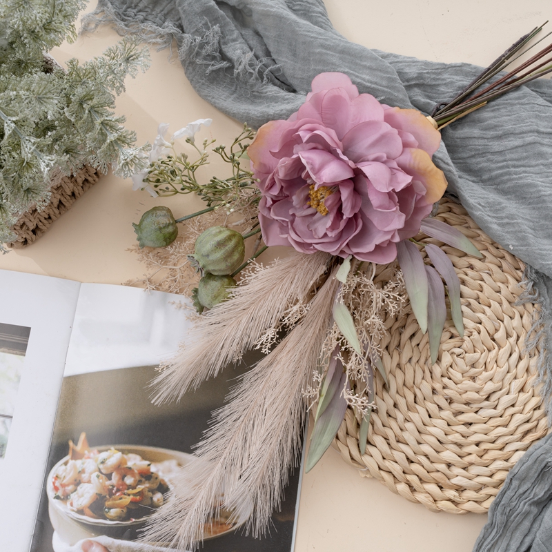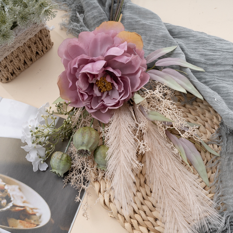 The DY1-5521 is a harmonious fusion of handmade artistry and machine precision. The dried peony flowers, with their delicate petals and intricate layers, are meticulously selected and arranged by skilled artisans, who breathe life into each blossom through their deft hands. The poppy fruits, with their vibrant hues and unique texture, add a touch of whimsy and intrigue to the arrangement. Meanwhile, the silky hairy grass, with its soft and flowing texture, complements the overall aesthetic, creating a sense of serenity and tranquility.