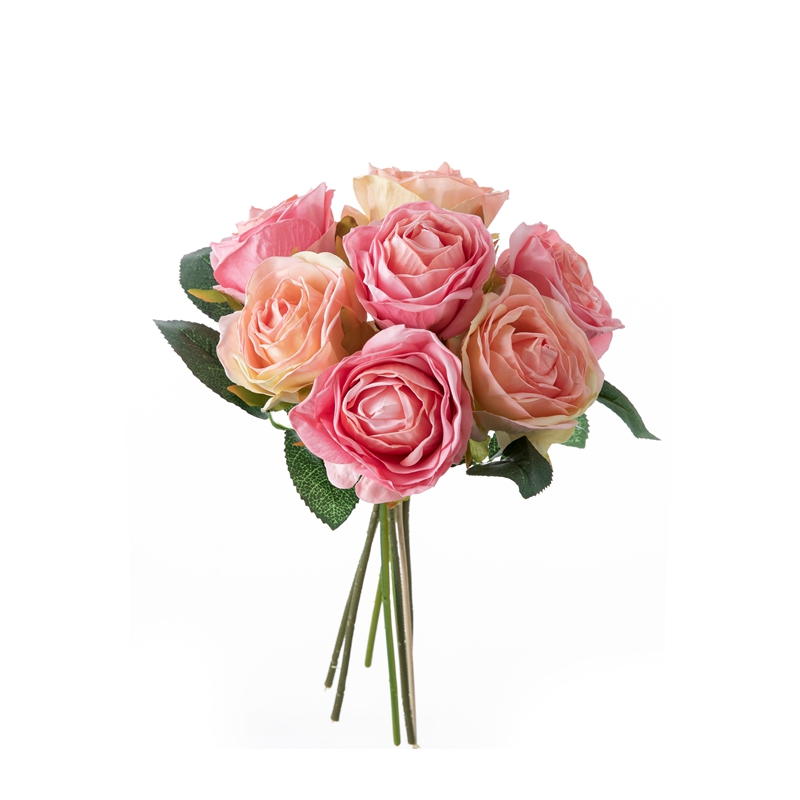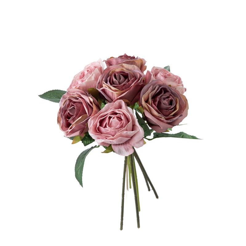 Measuring an overall height of 29cm and a graceful diameter of 16cm, the DY1-5904 stands tall and proud, commanding attention wherever it's placed. Its seven exquisite rose heads, each boasting a height of 4cm and a diameter of 6cm, are a sight to behold, their fullness and symmetry meticulously achieved through a harmonious blend of handmade precision and machine-assisted perfection. The petals, resembling velvety softness, whisper tales of love and devotion, while the accompanying leaves add a touch of verdant vitality, completing the picture of nature's splendor.