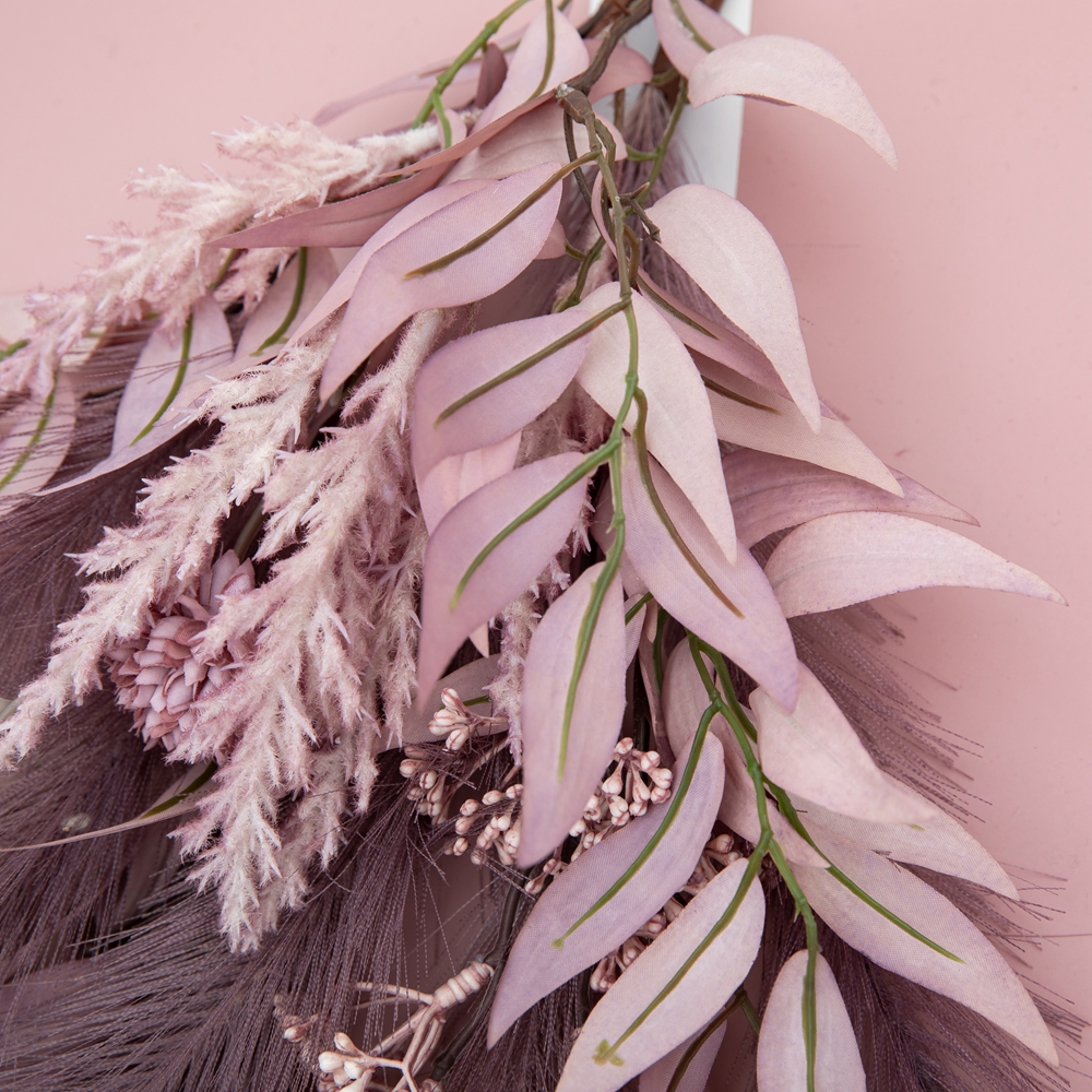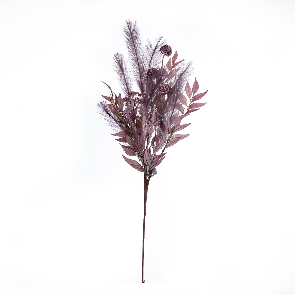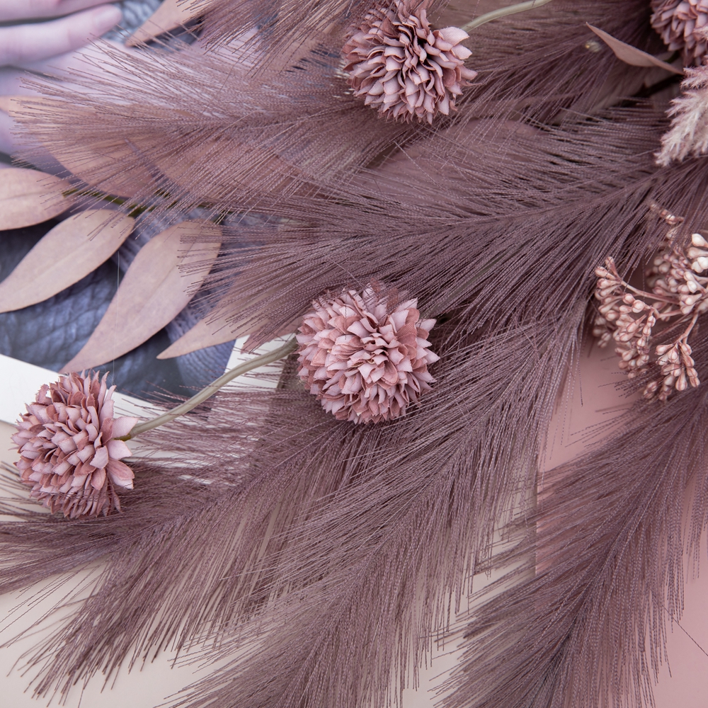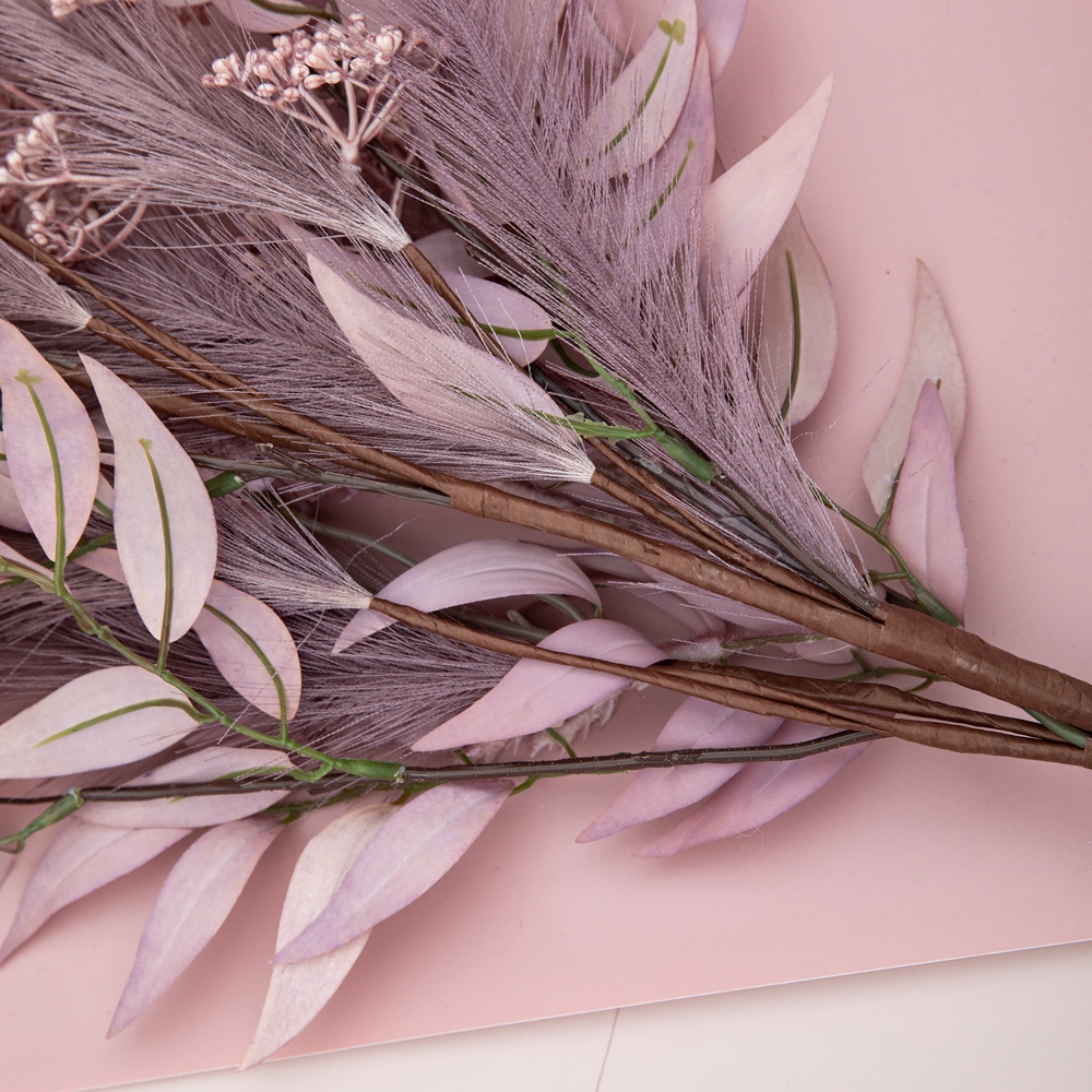 Each bunch is delicately composed, featuring four intricately detailed bulbs, a set of tufted bean shoots, seven sticks of graceful pampas grass, a collection of soft flocking woolly grass, and three sets of lush leaves. The rich purple color scheme adds a touch of luxury and sophistication, making this chrysanthemum branch a perfect accent for a wide range of occasions and environments. Whether displayed alone or combined with other floral arrangements, this branch is sure to enhance the ambiance of any space.