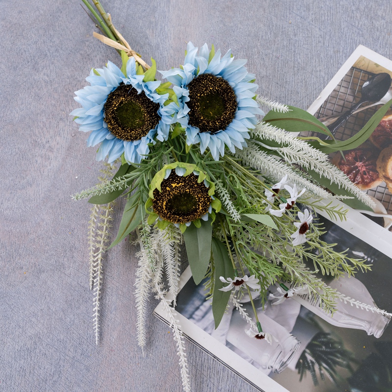 Rounding out the DY1-7167 Sunflower Plastic Piece Bunches are sprigs of rosemary and bamboo leaves. The aromatic rosemary adds a subtle fragrance to the bouquet, while the bamboo leaves provide a touch of greenery that brings the whole composition to life. This carefully curated mix of elements creates a visually stunning and emotionally uplifting experience that is sure to delight.