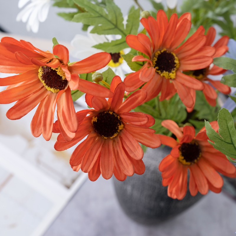 What sets the DY1-7307 apart is its unique design, featuring four bifurcated African chrysanthemum flowers that intertwine seamlessly with lush, lifelike leaves. This meticulous attention to detail creates a visual symphony, where each petal and every leaf contributes to an overall aesthetic that is both organic and refined. The flowers, arranged in a carefully curated fashion, exude a warmth and vitality that is bound to invigorate any ambiance.