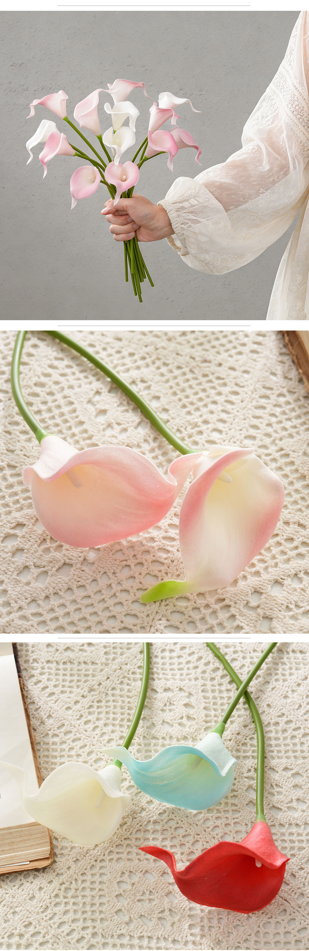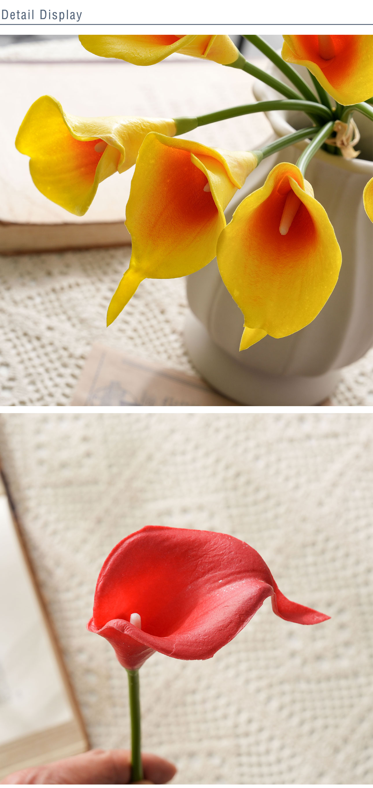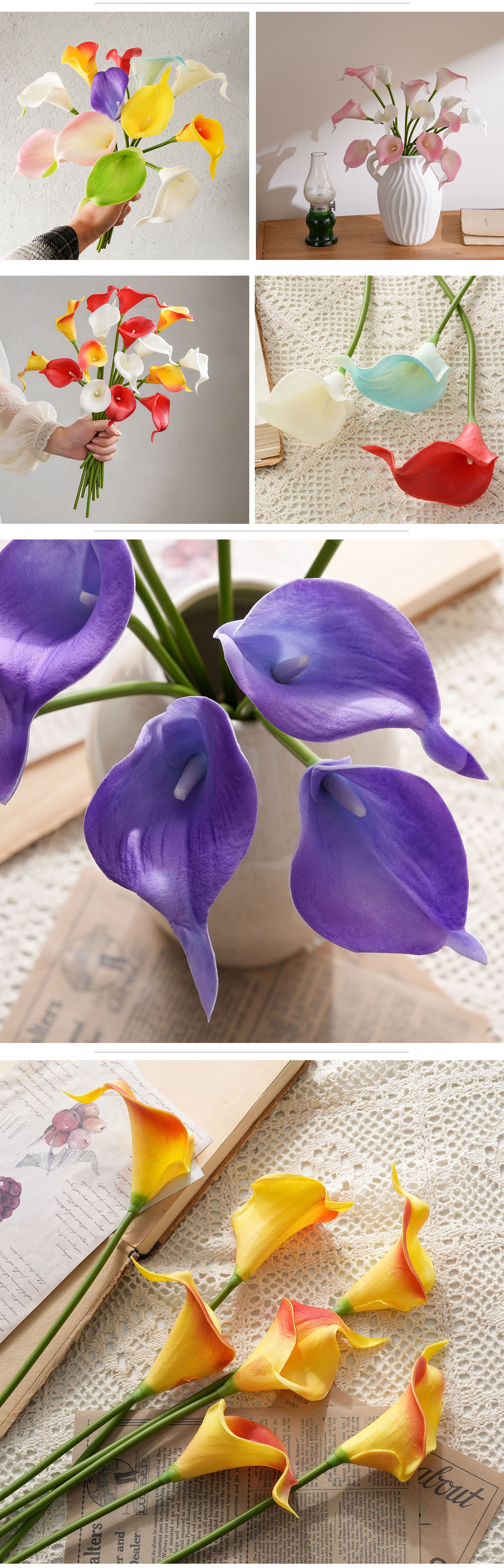 Crafted from high-quality PU and Plastic materials, the artificial calla lily not only boasts a realistic appearance but also adheres to eco-friendly standards—an essential feature for today’s environmentally conscious consumers. With a compact size of 79*24*17cm and a lightweight design of just 9g, it is easy to handle, arrange, and store, while its impressive height of 34.5cm ensures it catches the eye without being overwhelming. The production process blends handmade craftsmanship with precise machine manufacturing, resulting in a product that balances artisanal detail with consistent quality, further certified by BSCI to meet international ethical and quality standards.