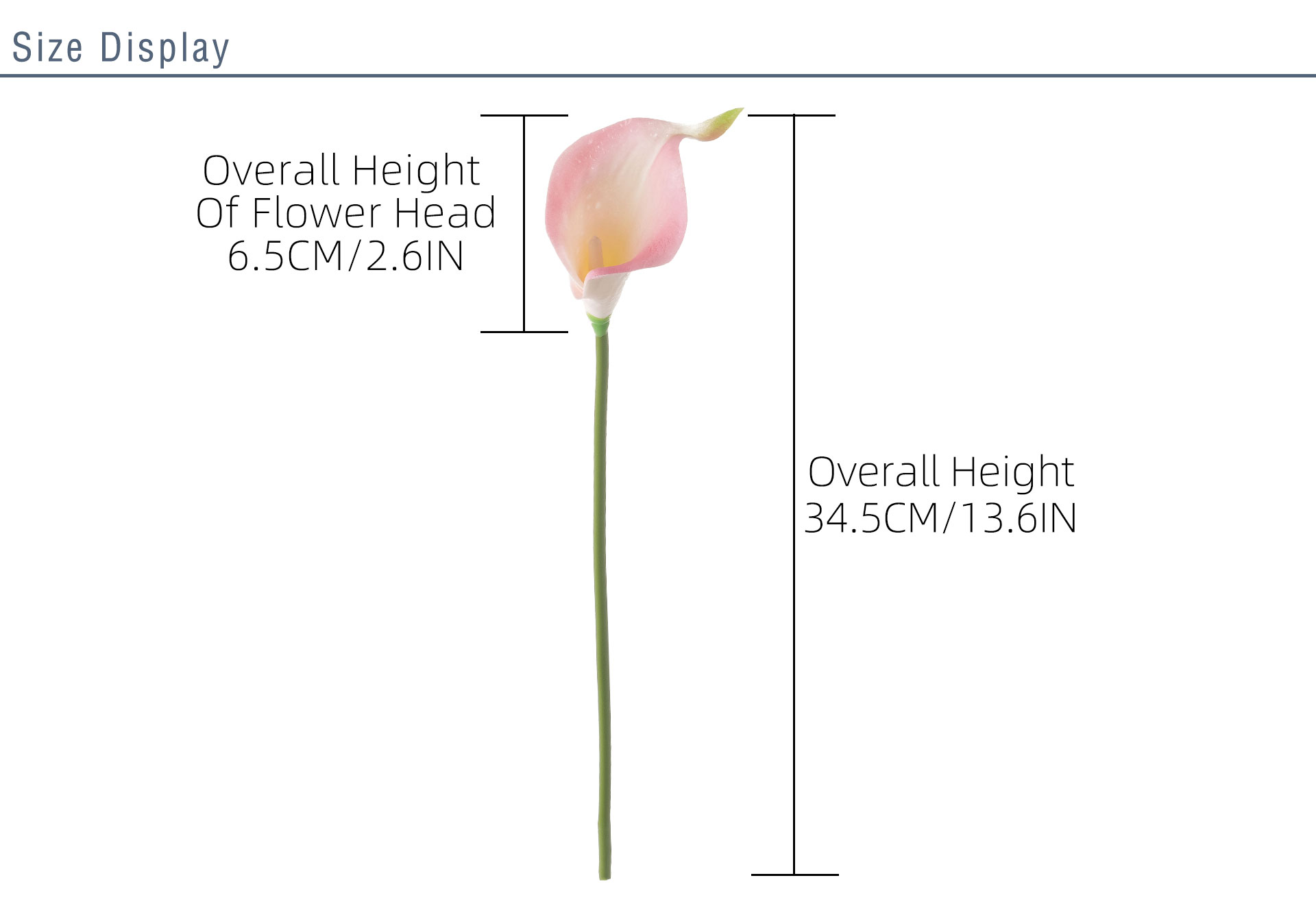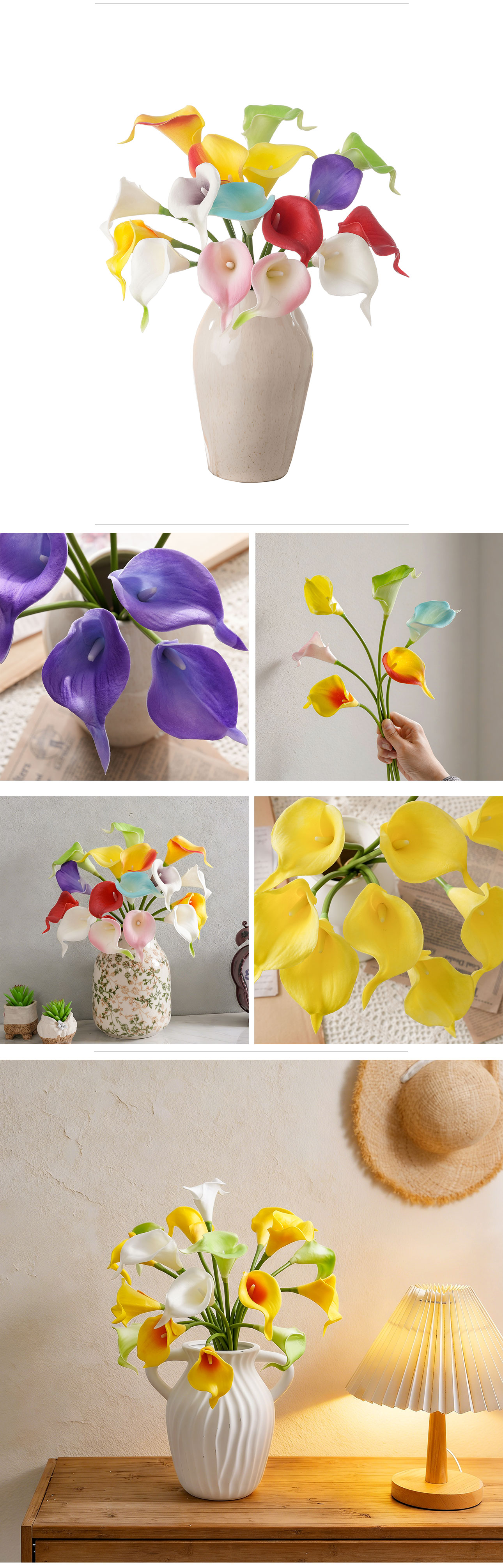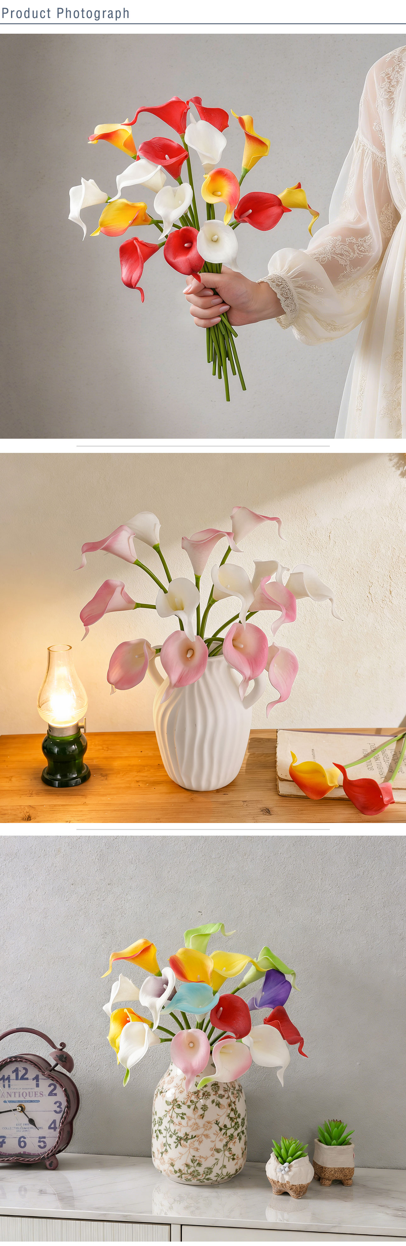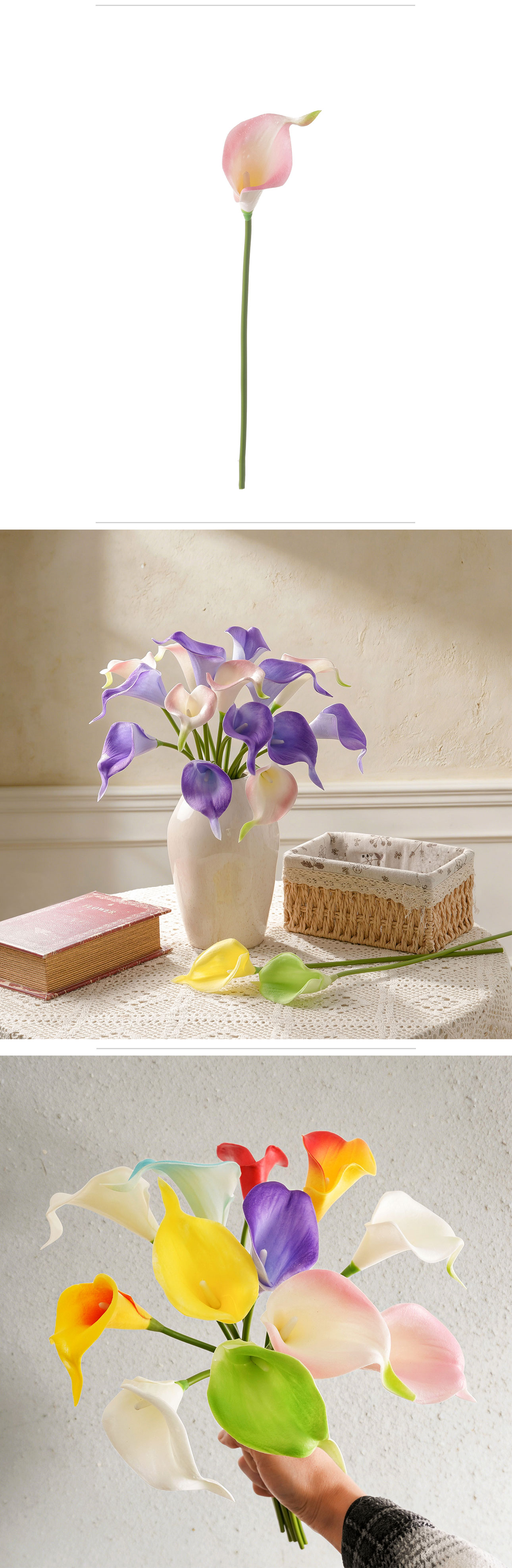 Crafted from high-quality PU and Plastic materials, the artificial calla lily not only boasts a realistic appearance but also adheres to eco-friendly standards—an essential feature for today’s environmentally conscious consumers. With a compact size of 79*24*17cm and a lightweight design of just 9g, it is easy to handle, arrange, and store, while its impressive height of 34.5cm ensures it catches the eye without being overwhelming. The production process blends handmade craftsmanship with precise machine manufacturing, resulting in a product that balances artisanal detail with consistent quality, further certified by BSCI to meet international ethical and quality standards.