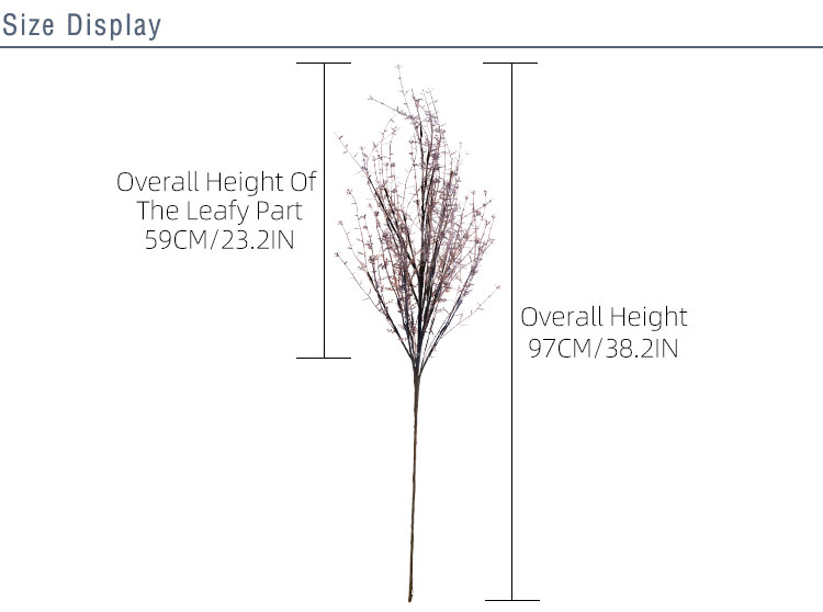 In a Shandong there was a brand called CALLAFLORAL that created the most adorable artificial plants. One of their special creations was the Flocked Long Branches Artificial Plants, also known as Item No. MW09109.These plants were made with love and care, using a combination of plastic, flocking, wire, and paper. They were designed to bring a touch of nature into any space. With an overall height of 97 cm and leaves that added to a height of 59 cm, these plants were the perfect addition to any room.