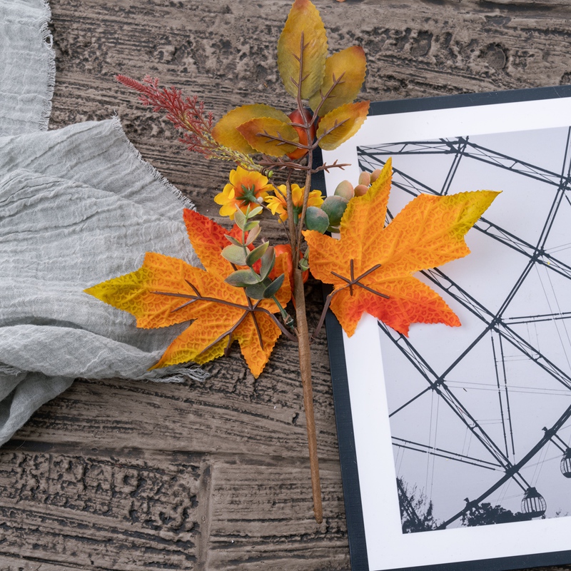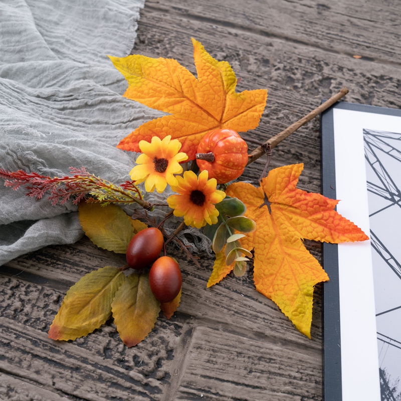 Imagine placing the Maple Leaf Pumpkin Sprig on a mantlepiece during the festive season, or using it as a centerpiece for a dinner table adorned with rustic autumn decor. Its vibrant colors and intricate details will serve as a conversation starter, drawing guests' eyes and evoking a sense of wonder and delight. As a photographic prop, it adds a touch of authenticity and charm to any shoot, whether you are capturing memories of a family gathering or a professional portfolio.