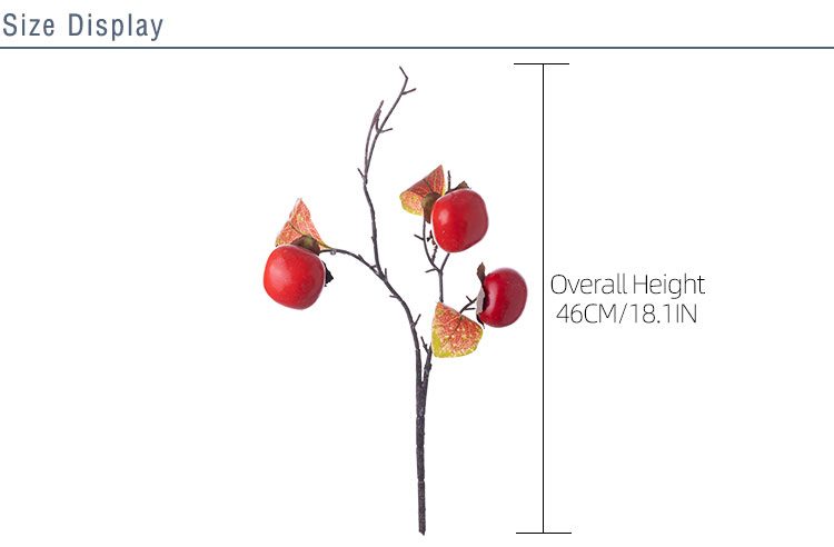 The colors, a vibrant red and orange that dance in the light, evoke the essence of autumn's harvest, bringing a touch of nature's bounty indoors. The hand-sculpted fruits, with their diameter of 5.3cm and height of 3.8cm, rest atop gracefully curved branches, accompanied by three matching leaves that complete the picture of natural beauty.