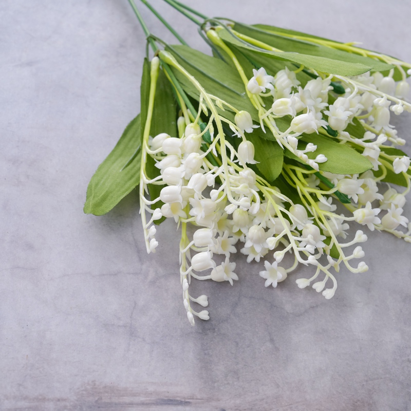 Each bundle, priced as a cohesive unit, showcases five branches, each intricately adorned with three stems of lily of the valley, their ivory hues echoing the purity and innocence of spring. The accompanying leaves, meticulously matched to complement the delicate blooms, complete the illusion of a living, breathing arrangement, inviting viewers into a world of tranquility and serenity.