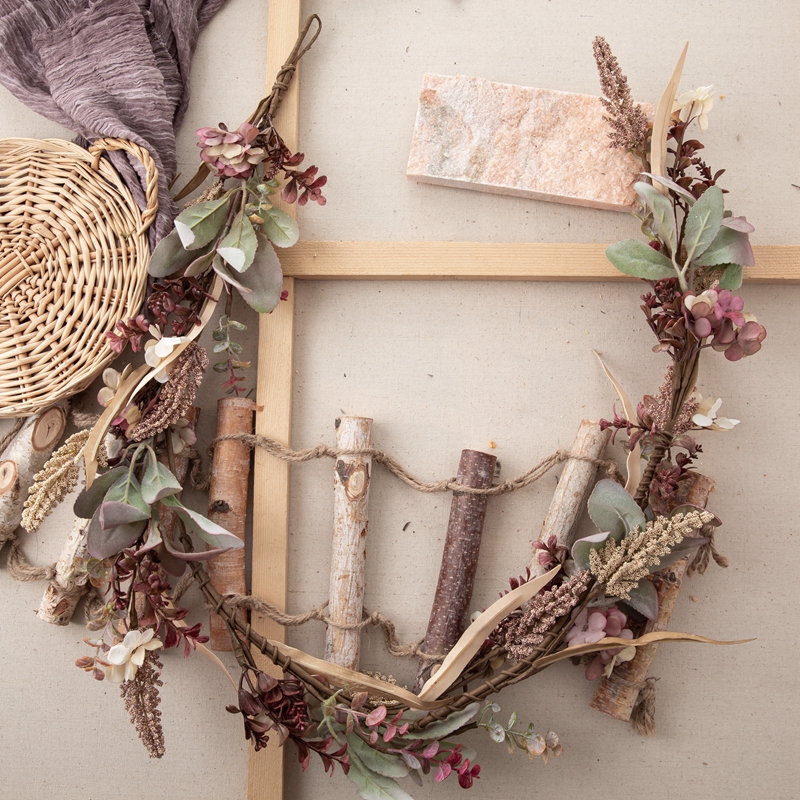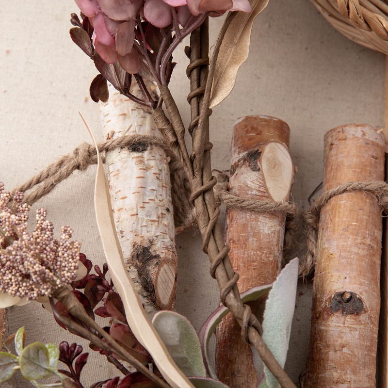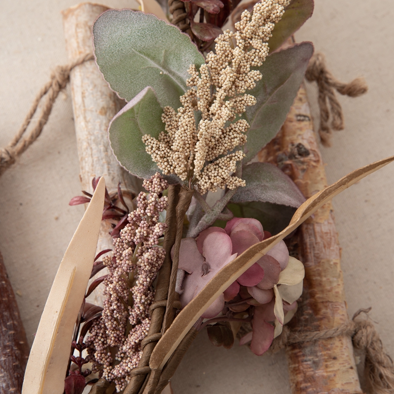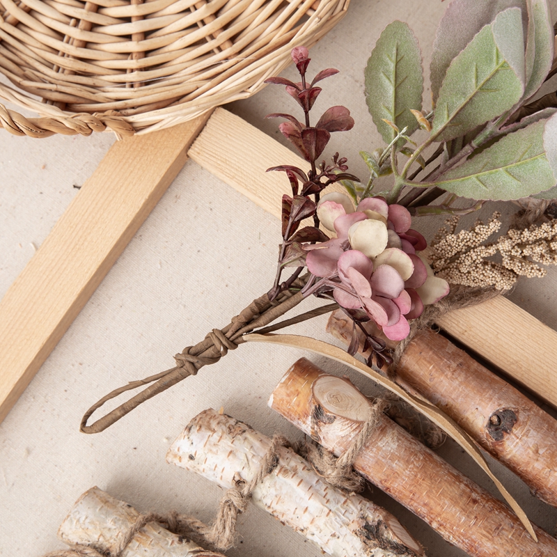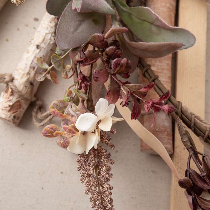 MW61513 is a vibrant blend of autumn hues, a tapestry of eucalyptus, hydrangeas, pine cones, and long vines, all exquisitely arranged to create a scene that is both enchanting and enchanted. The piece is a harmonious union of Plastic, foam, flocking, and hand-wrapped paper, each material chosen for its unique properties that contribute to the overall aesthetic and durability of the product.