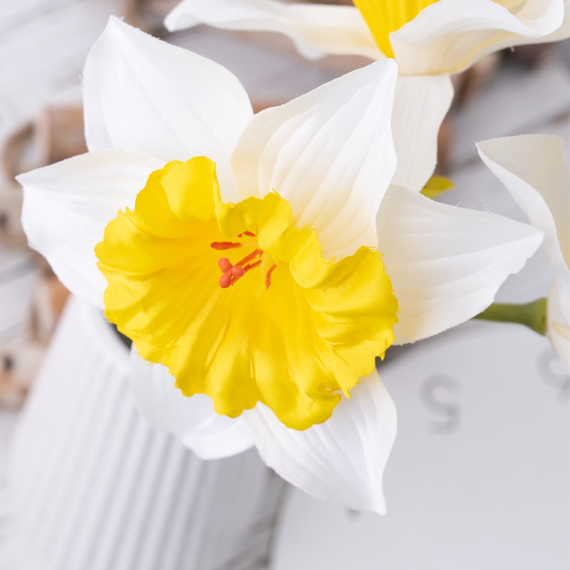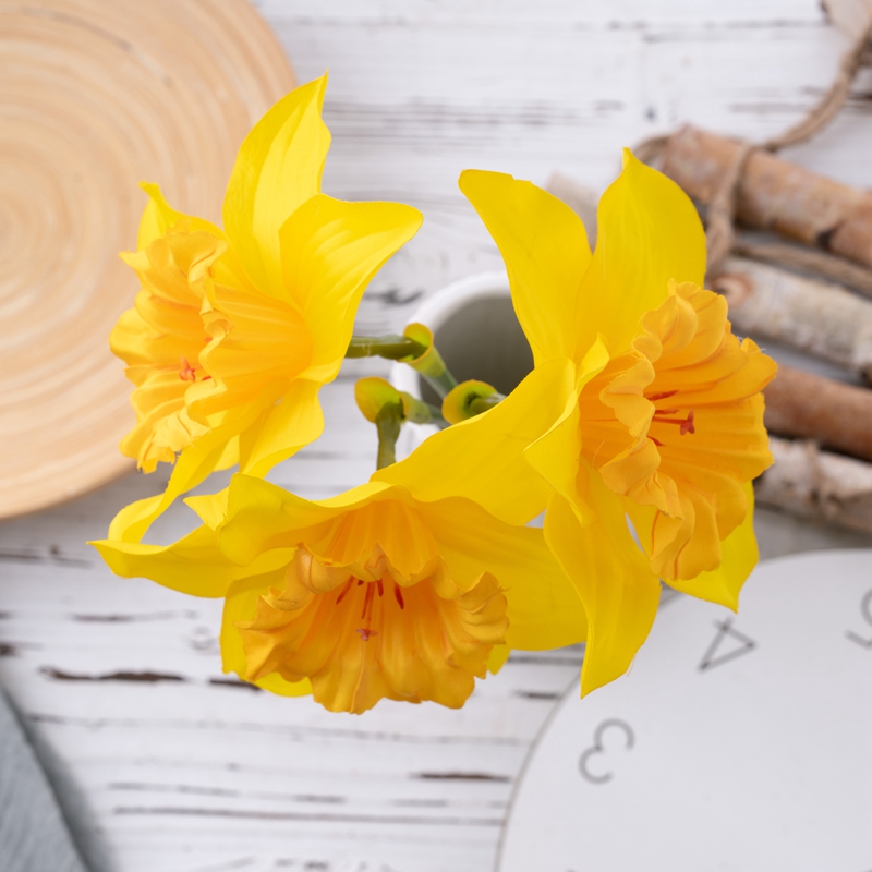 The daffodil heads, measuring 4cm in height and 13cm in diameter, are the crowning glory of this decorative piece. Their lifelike appearance and intricate detailing are a testament to the skilled craftsmanship of the artisans who created them. The daffodil heads come in a bundle of three, offering a lush and vibrant display that is sure to draw admiring glances.