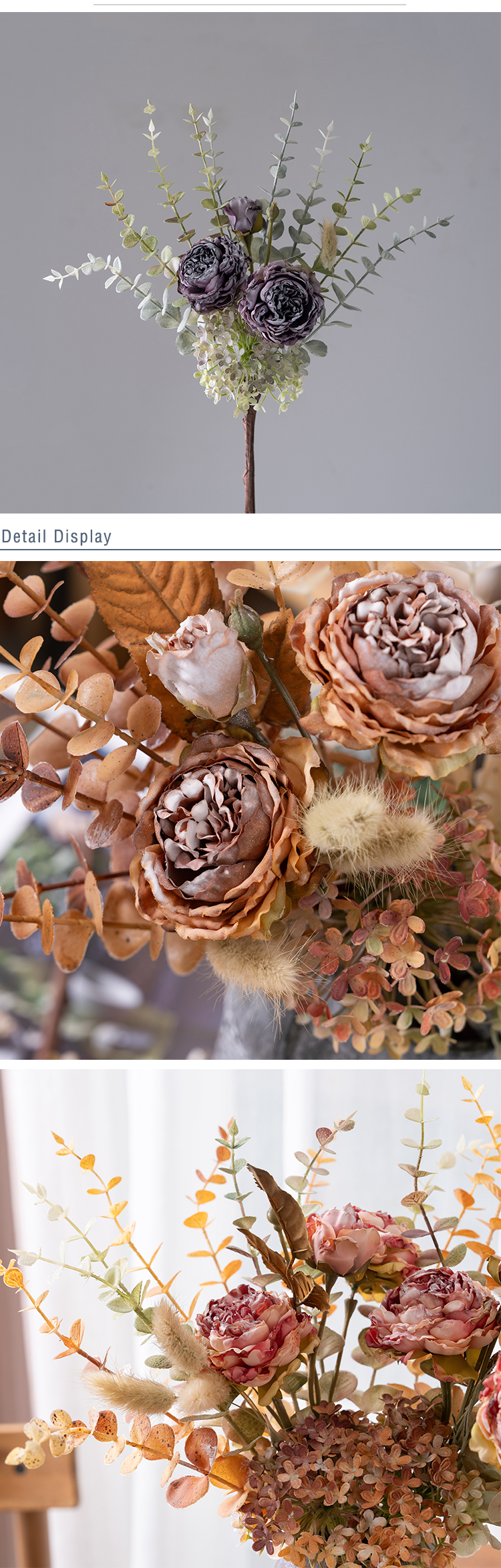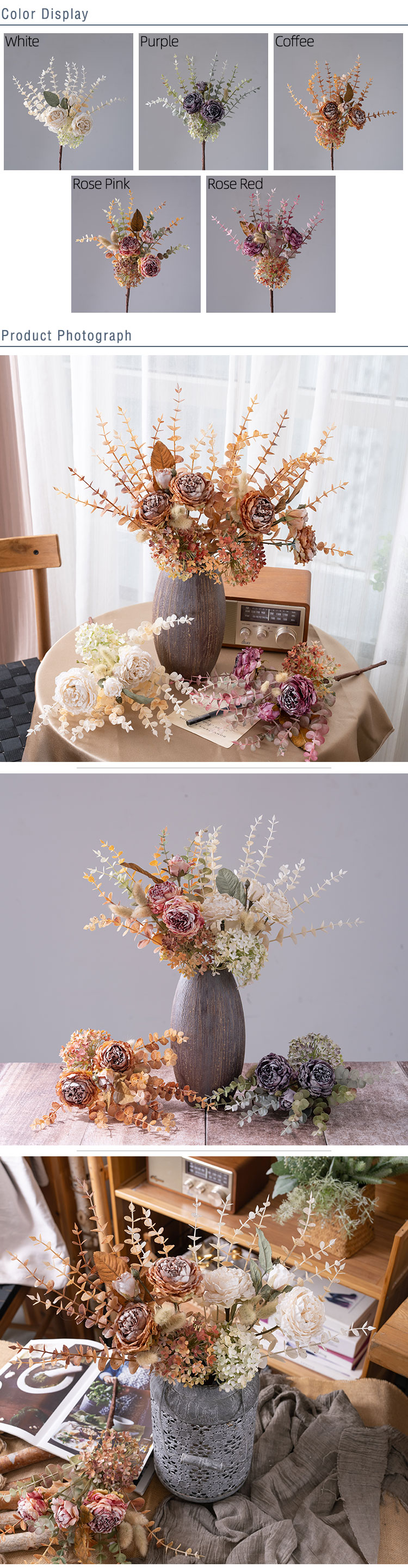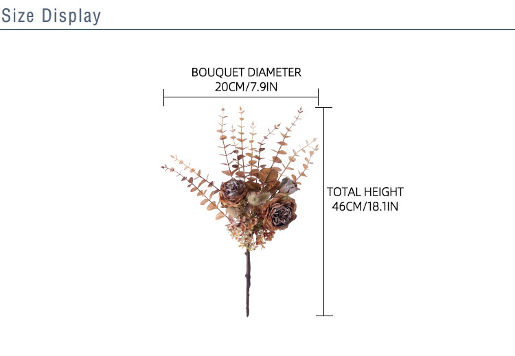 Introducing the MW89105 Artificial Dried Roses Eucalyptus Bundle from CALLAFLORAL, a stunning addition that brings the beauty of nature indoors all year round. This carefully crafted bouquet is designed to elevate the ambiance of any space, making it a versatile and charming decorative piece.The bundle is crafted using a combination of high - quality materials. The roses and other floral elements are made from fabric, which gives them a soft, realistic texture. The stems are constructed from a blend of plastic and wire, ensuring durability and flexibility for easy arrangement. Additionally, paper is used in some parts of the design, adding a touch of authenticity and detail. With an overall height of 46 cm and an overall diameter of 20 cm, this bouquet is the perfect size to make a statement without overwhelming the space. Each rose head measures 7.5 cm in diameter and 4 cm in height, while the rose buds are 4.5 cm in diameter and also 4 cm in height. Despite its eye - catching size, the bouquet is lightweight, weighing only 89.8g, making it easy to handle and move around as needed.Each purchase of the MW89105 includes one bouquet. Inside, you'll find two fully bloomed roses, one delicate rose bud, and an assortment of matching flowers, grass, and leaves. This combination creates a harmonious and visually appealing arrangement that mimics the look of a freshly picked bouquet. The bouquets are packaged securely in inner boxes. Each inner box has dimensions of 80x30x15 cm and can hold 12 pieces of the MW89105 bouquet. This packaging ensures that the products arrive in perfect condition, ready to be displayed or used as gifts.To make your shopping experience as convenient as possible, CALLAFLORAL offers a variety of payment methods. You can choose from L/C (Letter of Credit), T/T (Telegraphic Transfer), Western Union, Money Gram, Paypal, and more. This flexibility allows customers from around the world to purchase the Artificial Dried Roses Eucalyptus Bundle with ease. CALLAFLORAL is a reputable brand known for its high - quality floral products. This particular bouquet is proudly made in Shandong, China, a region renowned for its skilled craftsmanship and attention to detail in the manufacturing industry.The product is certified with ISO9001 and BSCI, which are internationally recognized standards for quality management and social accountability. These certifications guarantee that the MW89105 Artificial Dried Roses Eucalyptus Bundle is produced in an environment that adheres to strict quality and ethical guidelines. To suit different tastes and interior design styles, the bouquet is available in a range of beautiful colors. You can choose from coffee, pink rose, purple, rose red, and white. Whether you prefer a warm and earthy tone or a bright and vibrant one, there's a color option to match your preferences.The bouquet is a result of a combination of handmade and machine - made techniques. The handmade elements add a unique and personalized touch, while the machine - made parts ensure precision and consistency in the overall design. This blend of techniques results in a high - quality product that looks both natural and artistic. The MW89105 Artificial Dried Roses Eucalyptus Bundle is incredibly versatile and can be used in a wide variety of settings and for numerous occasions. It's perfect for enhancing the decor of your home, whether it's in the living room, bedroom, or hallway. It also adds a touch of elegance to hotels, hospitals, shopping malls, wedding venues, company offices, and outdoor spaces.In addition to daily home and commercial decor, it serves as an excellent photographic prop, exhibition piece, or supermarket display. It's also an ideal gift for special occasions such as Valentine's Day, carnivals, Women's Day, Labor Day, Mother's Day, Children's Day, Father's Day, Halloween, Beer Festivals, Thanksgiving, Christmas, New Year's Day, Adult's Day, and Easter. In conclusion, the CALLAFLORAL MW89105 Artificial Dried Roses Eucalyptus Bundle is a must - have for anyone looking to add a touch of natural beauty and charm to their surroundings. With its high - quality materials, exquisite design, and wide range of uses, it's sure to become a favorite decorative piece in any space.