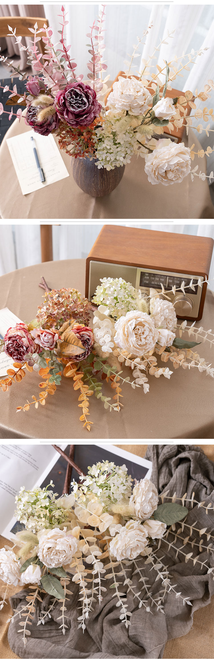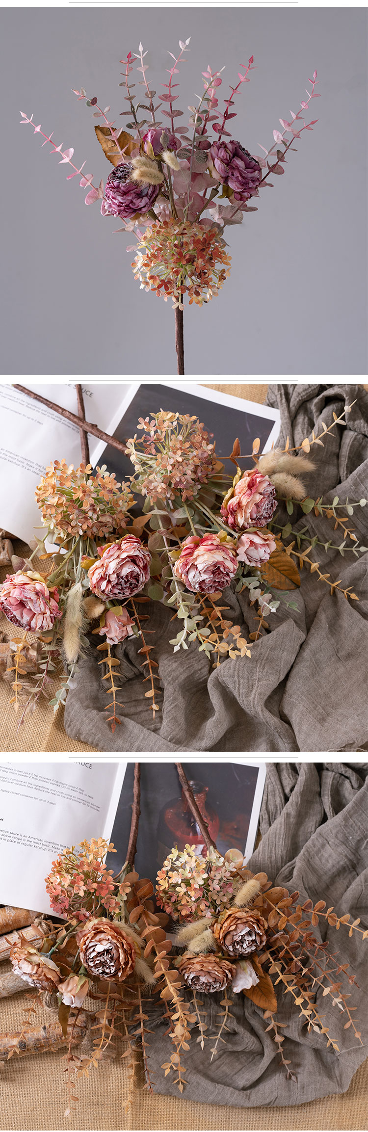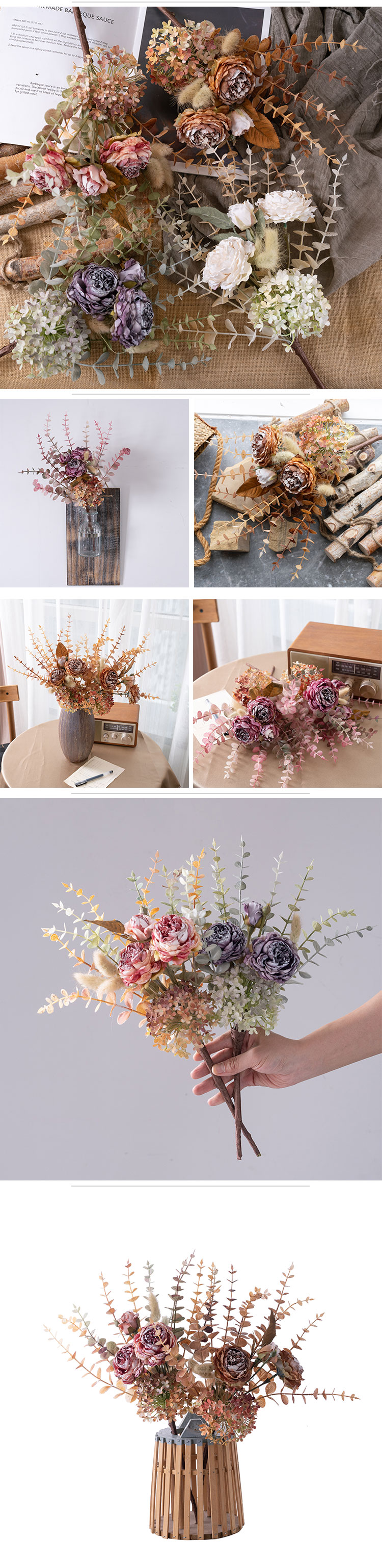 Introducing the MW89105 Artificial Dried Roses Eucalyptus Bundle from CALLAFLORAL, a stunning addition that brings the beauty of nature indoors all year round. This carefully crafted bouquet is designed to elevate the ambiance of any space, making it a versatile and charming decorative piece.The bundle is crafted using a combination of high - quality materials. The roses and other floral elements are made from fabric, which gives them a soft, realistic texture. The stems are constructed from a blend of plastic and wire, ensuring durability and flexibility for easy arrangement. Additionally, paper is used in some parts of the design, adding a touch of authenticity and detail. With an overall height of 46 cm and an overall diameter of 20 cm, this bouquet is the perfect size to make a statement without overwhelming the space. Each rose head measures 7.5 cm in diameter and 4 cm in height, while the rose buds are 4.5 cm in diameter and also 4 cm in height. Despite its eye - catching size, the bouquet is lightweight, weighing only 89.8g, making it easy to handle and move around as needed.Each purchase of the MW89105 includes one bouquet. Inside, you'll find two fully bloomed roses, one delicate rose bud, and an assortment of matching flowers, grass, and leaves. This combination creates a harmonious and visually appealing arrangement that mimics the look of a freshly picked bouquet. The bouquets are packaged securely in inner boxes. Each inner box has dimensions of 80x30x15 cm and can hold 12 pieces of the MW89105 bouquet. This packaging ensures that the products arrive in perfect condition, ready to be displayed or used as gifts.To make your shopping experience as convenient as possible, CALLAFLORAL offers a variety of payment methods. You can choose from L/C (Letter of Credit), T/T (Telegraphic Transfer), Western Union, Money Gram, Paypal, and more. This flexibility allows customers from around the world to purchase the Artificial Dried Roses Eucalyptus Bundle with ease. CALLAFLORAL is a reputable brand known for its high - quality floral products. This particular bouquet is proudly made in Shandong, China, a region renowned for its skilled craftsmanship and attention to detail in the manufacturing industry.The product is certified with ISO9001 and BSCI, which are internationally recognized standards for quality management and social accountability. These certifications guarantee that the MW89105 Artificial Dried Roses Eucalyptus Bundle is produced in an environment that adheres to strict quality and ethical guidelines. To suit different tastes and interior design styles, the bouquet is available in a range of beautiful colors. You can choose from coffee, pink rose, purple, rose red, and white. Whether you prefer a warm and earthy tone or a bright and vibrant one, there's a color option to match your preferences.The bouquet is a result of a combination of handmade and machine - made techniques. The handmade elements add a unique and personalized touch, while the machine - made parts ensure precision and consistency in the overall design. This blend of techniques results in a high - quality product that looks both natural and artistic. The MW89105 Artificial Dried Roses Eucalyptus Bundle is incredibly versatile and can be used in a wide variety of settings and for numerous occasions. It's perfect for enhancing the decor of your home, whether it's in the living room, bedroom, or hallway. It also adds a touch of elegance to hotels, hospitals, shopping malls, wedding venues, company offices, and outdoor spaces.In addition to daily home and commercial decor, it serves as an excellent photographic prop, exhibition piece, or supermarket display. It's also an ideal gift for special occasions such as Valentine's Day, carnivals, Women's Day, Labor Day, Mother's Day, Children's Day, Father's Day, Halloween, Beer Festivals, Thanksgiving, Christmas, New Year's Day, Adult's Day, and Easter. In conclusion, the CALLAFLORAL MW89105 Artificial Dried Roses Eucalyptus Bundle is a must - have for anyone looking to add a touch of natural beauty and charm to their surroundings. With its high - quality materials, exquisite design, and wide range of uses, it's sure to become a favorite decorative piece in any space.