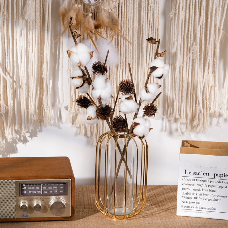 In home decoration, placing four cotton stem flowers in a simple glass vase and putting it in the corner of the living room can instantly become the focus of the space. The plain white cotton and the transparent glass vase complement each other, creating a clean and transparent feeling.