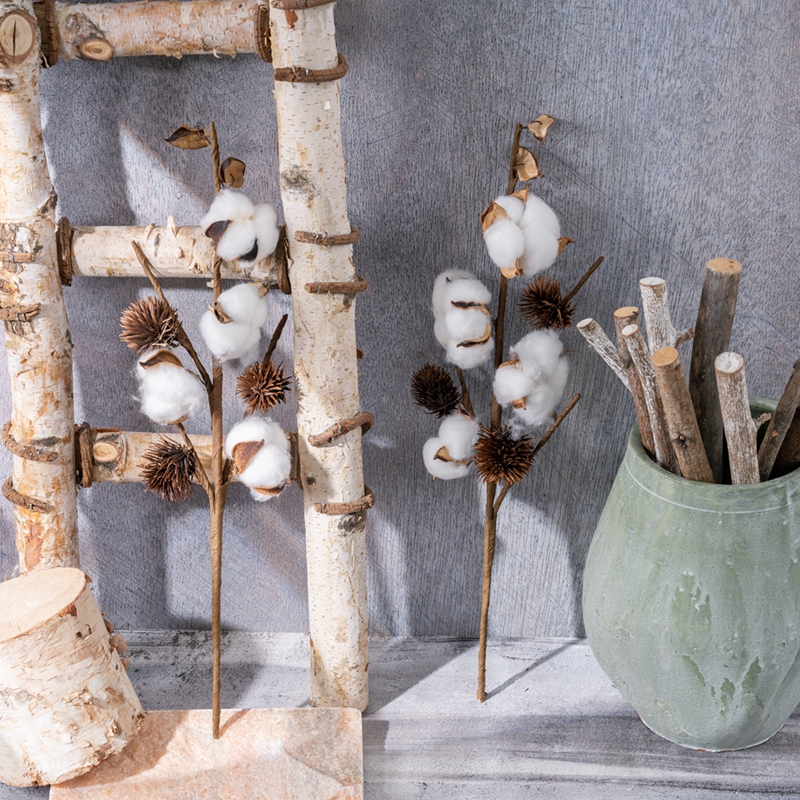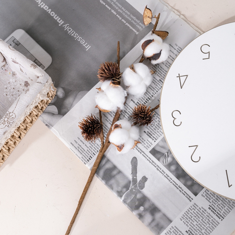 The dried flowers on four cotton branches are gentle works of art bestowed by nature. The flower buds of cotton are fluffy and soft, as if they were fragments left behind by clouds on earth. Their pure and flawless color exudes a kind of pure and simple beauty. Each cotton flower is composed of countless fine cotton fluff, which interweave and entwine with each other to form round and plump small balls, delicate and light.
