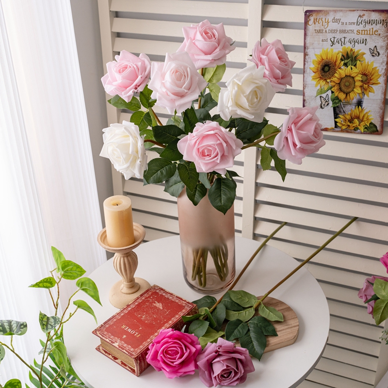 As a single head artificial flower, its greatest advantage lies in its flexibility and versatility, which enables it to precisely illuminate every corner of the home and infuse the space with a gentle atmosphere. On the light colored coffee table in the living room, place a single-head moist textured fabric rose, paired with a small transparent glass vase.