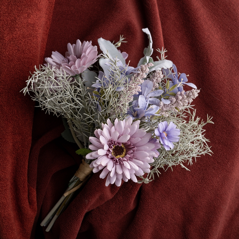 The addition of the sweet violet further adds a soul to this bouquet. It also brings a touch of romance and poetry to the entire space. Even the insignificant small corner can become tender because of it.The combination of leaves and grass adds abundant vitality and energy to the bouquet. It not only enriches the layers of the bouquet but also balances the overall visual effect, making the bouquet both soft and elegant like flowers and full of vitality like grass.