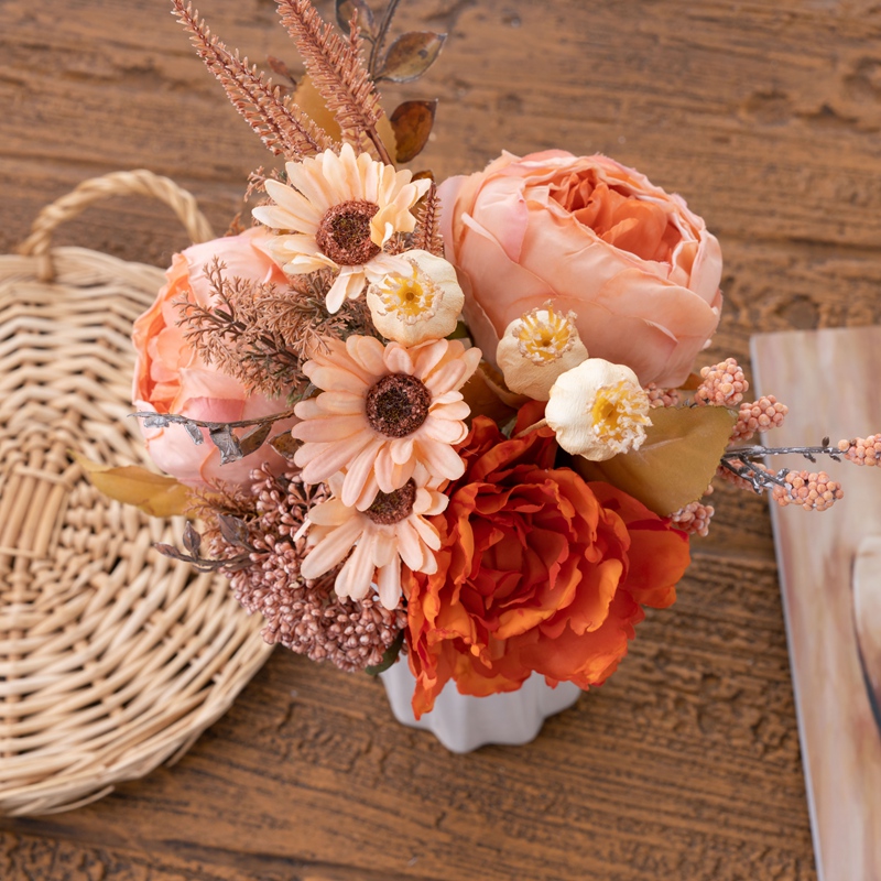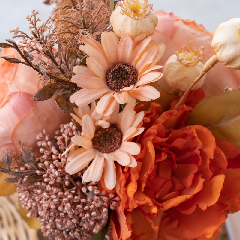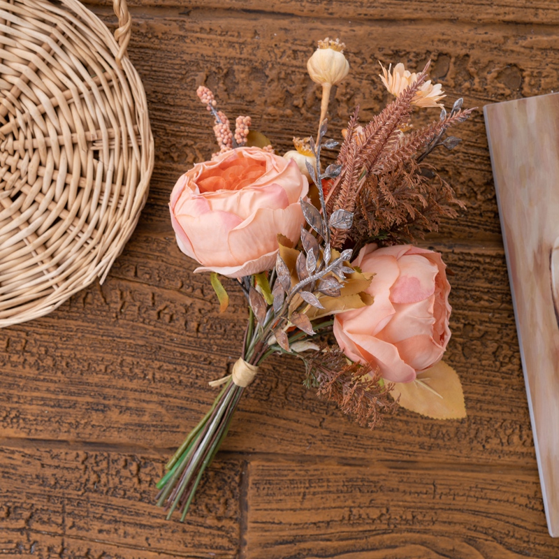 In addition to these primary floral elements, the PL24035 also features a variety of accessories that elevate the bouquet to new heights of elegance. Poppy fruit, rice fruit, and foam fruit branches add a touch of natural charm and whimsy, their textures and colors complementing the flowers perfectly. These accessories serve to soften the harder lines of the roses and peonies, creating a more cohesive and harmonious overall effect.