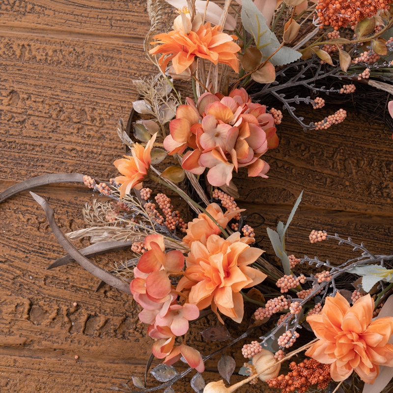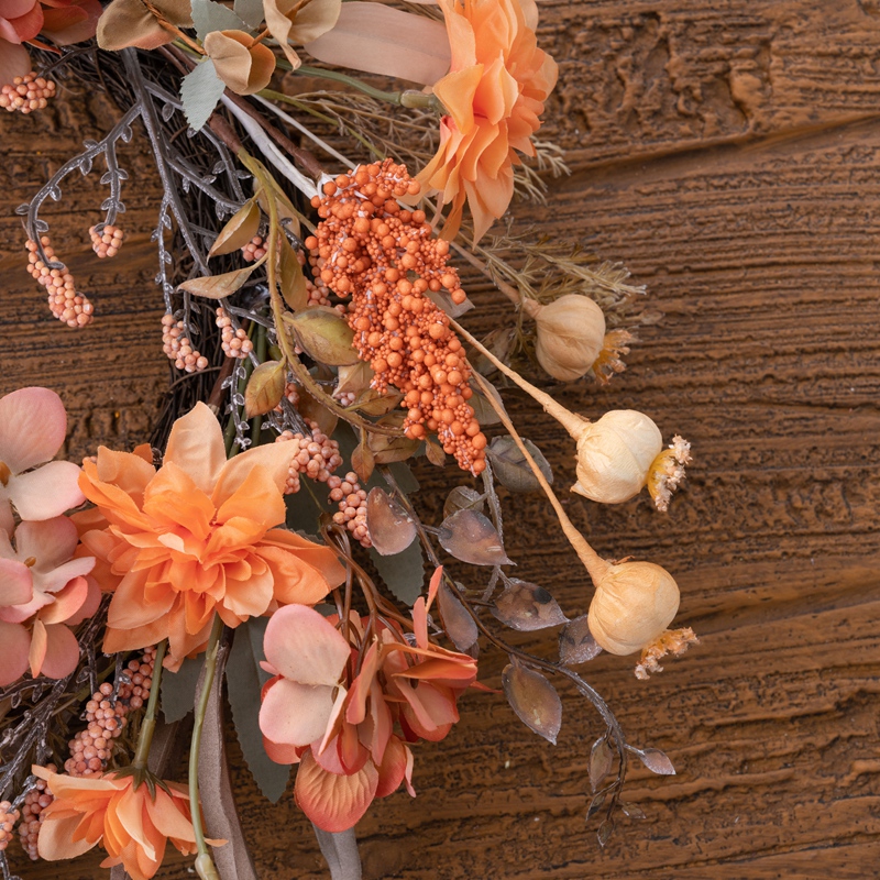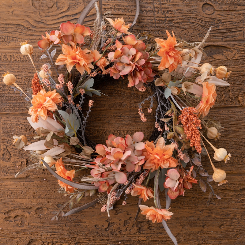 Crafted with meticulous attention to detail and an unwavering commitment to quality, this wreath is a masterpiece of floral artistry that combines the delicate charm of hydrangeas, the vibrant spirit of poppy fruits, and the timeless elegance of dahlias, all meticulously arranged on a sturdy wood branch base adorned with foam grains and other grass accessories.