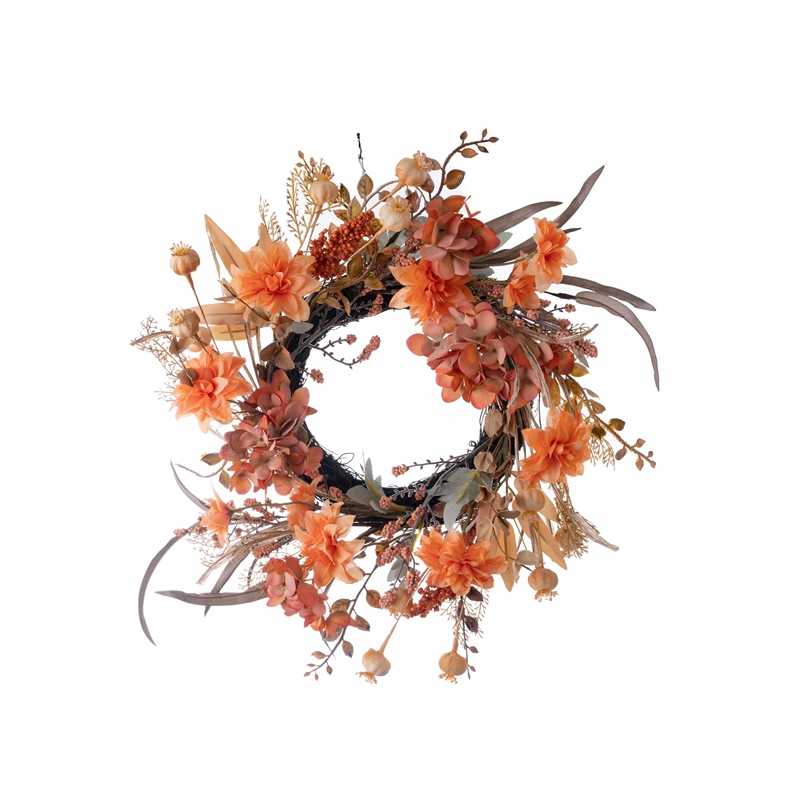 With an overall outer ring diameter of 50.8cm and an inner ring diameter of 24cm, the PL24042 is designed to be both visually impactful and versatile in its applications. The dahlia flower heads, each with a diameter of 8cm, stand out as the stars of this arrangement, their petals cascading gracefully to create a sense of movement and texture that brings the wreath to life. The tea roses, though not specified in size, add a touch of sweetness and refinement to the overall design, blending seamlessly with the other elements to create a harmonious and visually pleasing composition.